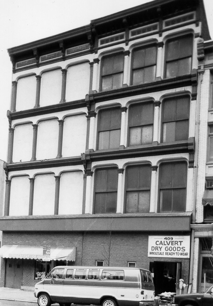 This building is significant as representing a full cast iron front type building. Documentary and structural evidence suggest that it was constructed at the same time as its neighbor, #407, about 1875. The property was owned at the time by the successful Reiman family, who owned a wholesale grocery company, and probably constructed the building. The boot and shoe factory of N. Hess and Brother occupied the building in 1876. Nathan Hess, shoemaker, immigrated from Germany in 1852 and began manufacturing shoes in Baltimore in 1872 in partnership with his brother Sol. Following the death of Nathan Hess in 1883, the Hess Shoes firm moved out of the building, and by 1898 Mendel Schwartz & Sons, wholesale clothiers, had become the occupants. Since that time, the structure has been occupied by four different dry goods or clothing stores. In 1983, the property was joined with the adjacent 407 W. Baltimore Street, and is currently occupied by the Discount Depot, a wholesale clothing business.