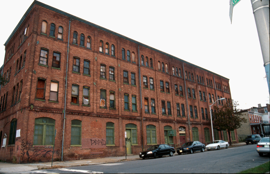 Erected in three stages between 1890 and c. 1910, the American Can Company, Miller Factory consists of a four-story brick manufacturing plant that occupies half of a city block in the northwestern section of Baltimore City. The building displays typical features of late-19th century industrial architecture, including a vertical division into base, shaft, and attic story segments; distinct bay divisions that are demarcated by engaged brick pilasters; and a corbeled brick cornice and string coursing. The factory encompasses a U-shaped footprint and features a part-gabled, part-hipped roof structure; segmental-and round-arched windows; and a substantial roof monitor on its c. 1910 section. The original 1890 section of the plant consists of a four-story, brick rectangular block with a combination hip and gable roof. This building was seven bays long east-west by two wide. In 1895, the company expanded the building by another five bays to the east, along West 26th Street. At the same time, a seven bay by two bay rear wing was constructed on the east end of the north facade. The building acquired its U-shaped footprint c. 1910 when a large three-story, eight bay long by five bay wide addition was made to the west end of the north facade. The 1890-1895 portions of the plant display the vertical division mentioned above. The one-story base consists of 11 recessed bays along the south elevation and the southernmost two bays along the west facade. Shallow brick pilasters divide the bays. Seven of the 11 bays along the south elevation contain a set of paired windows topped by a segmental-arch transom and a brick jack-arch lintel. The remaining bays have or had doorways. The central two stories are organized around 12 evenly spaced recessed bays, each of which holds two segmental arch windows at each story. Groupings of three round-arched windows, set off by a corbeled brick stringcourse, occupy the 12 attic story bays of the building. Facing west onto North Howard Street, the main entrance occupies the west elevation of the original 1890 building. This elevation contains two distinct bays that are divided vertically into base, shaft, and attic segments by corbeled brick stringcourses set at the top of the first story and just below the sills of the fourth story windows. The door and a single window occupy the north bay, while a paired set of windows occupy the south bay. Originally, two oversized loading-bay entrances were in this location, crowned by brick jack-arches which still adorn both bays. Four groupings of three segmental-arched window openings occupy the second and third stories, and the attic holds two groups of round-arched windows. The interior of the factory has undergone numerous alterations, but the open floor plan and bay divisions remain essentially intact. The oldest, four-story sections of the building feature wood tongue-and-groove floors and heavy timber post-and-beam construction. The posts have chamfered corners to improve their resistance to fire, characteristic of the slow-burning construction methods of the period. The interior walls are mainly of painted brick. The massive wooden trusses that support the main roof are exposed on the fourth floor. Most of the original heavy iron-clad fire doors that separate the various manufacturing spaces remain in place. The c. 1910 addition displays a similar post-and-beam framing and an open floor plan on all levels. Despite changing uses over the past half century, the building remains substantially intact as a good example of late-19th century industrial architecture in Baltimore.