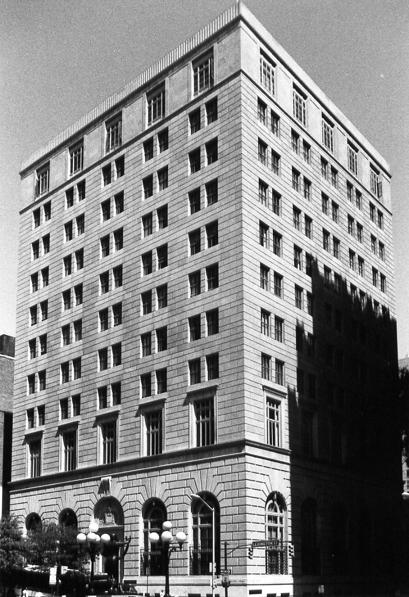 The Baltimore Federal Reserve Branch Bank is located at the northwest corner of Calvert and Lexington Streets, just north of Baltimore City’s financial district. The building, designed in the Second Renaissance Revival Style, is ten stories high and five bays wide on each elevation. It is constructed of masonry and steel, with completely rusticated limestone facing. The roof is flat. Like the early Italian Renaissance Florentine palazzi---the source for this design---the exterior is simply detailed. The first floor features limestone carvings and enormous arched windows. The second floor window have surrounds and hoods, while the rest of the windows are undetailed. The interior contains a spectacular, enormous main banking room with floors, teller stations, and Corinthian columns all of polished marble. The ceiling in this room and the elevator lobby to the west have ornate plaster decoration. There is intricate cast and molded bronze detail throughout. The floors above are simply finished. The integrity of the building is almost perfectly intact. The only major alterations have been the addition of offices in the banking room, the installation of more security equipment, and the renovation of the upper stories. The additional security equipment presents the only intrusion to the structure’s integrity.