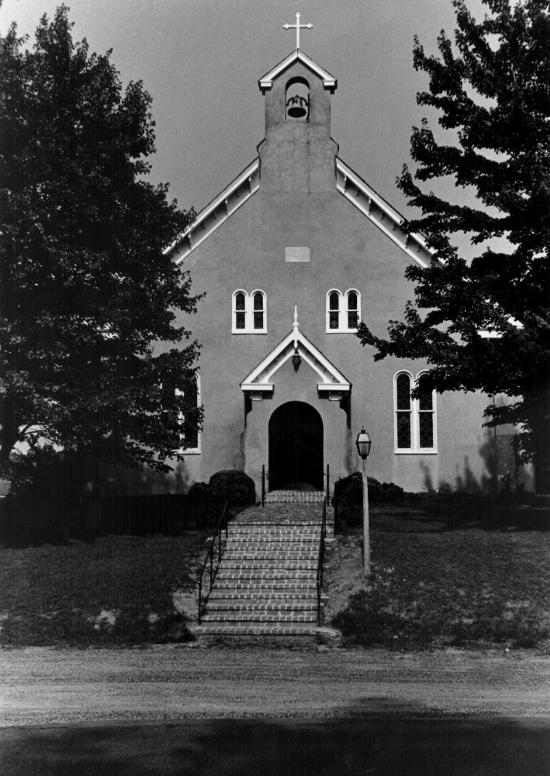 Facing west, the three-bay-wide Christ Church runs five bays in length on its north and south elevations. The beige stucco covered structure features stained glass in most of the tall paired round-arched sash windows. The west gable-end wall features a gable-roofed porch centered on the middle bay entry, bracketed cornice details, and a gable-roofed bell tower extending from a parapet wall breaking the main roof ridge. The north and south elevations are relieved by a series of stepped buttresses that are paired with perpendicular buttresses at the corners. Round-arched openings on the porch repeat the form of the windows further unifying the structural elements of this buildings, whose present form is clearly the result of several periods of evolution. The entrance porch in the center bay of the west facade features a bracketed return cornice with a finial at the peak, over a round-arched opening. Paired narrow round-arched windows flank the porch, and smaller versions of these occupy the gable above. The front gable is also decorated with a bracketed raking cornice. Pairs of round-arched windows appear between the buttresses on the north and west elevations. The interior of the church has an auditorium plan. The chancel is divided into three parts, with a central barrel-vaulted altar section and flanking arcaded sections to the north and south supported by columns. The ceiling height is lower in the central altar section of the chancel than in the main barrel-vaulted portion of the sanctuary. This demarcation of space is enhanced two steps up to the altar dais, an altar railing with turned balusters and substantial dropped pendant-like wall sections which extend perpendicular from the west wall to the chancel arcade columns. These arched wall sections are terminated by substantial acorn-turned pendills and open to the floor from approximately dado height. The north section of the chancel contains additional choir pews aligned with the north wall and a memorial font of carved limestone with brass detailing. The south section also contains a row of pews and an interior doorway to the vestry/sacristy addition. The fellowship hall, a substantial T-plan gable-roofed brick and cinder block structure, was built in 1958. A garden containing plants with Biblical references is planted adjacent to the hall and has been in place since at least the parish's tercentennial in 1972. The current 1950s rectory is a replacement of the tri-gable L-plan house that stood on approximately the same site.