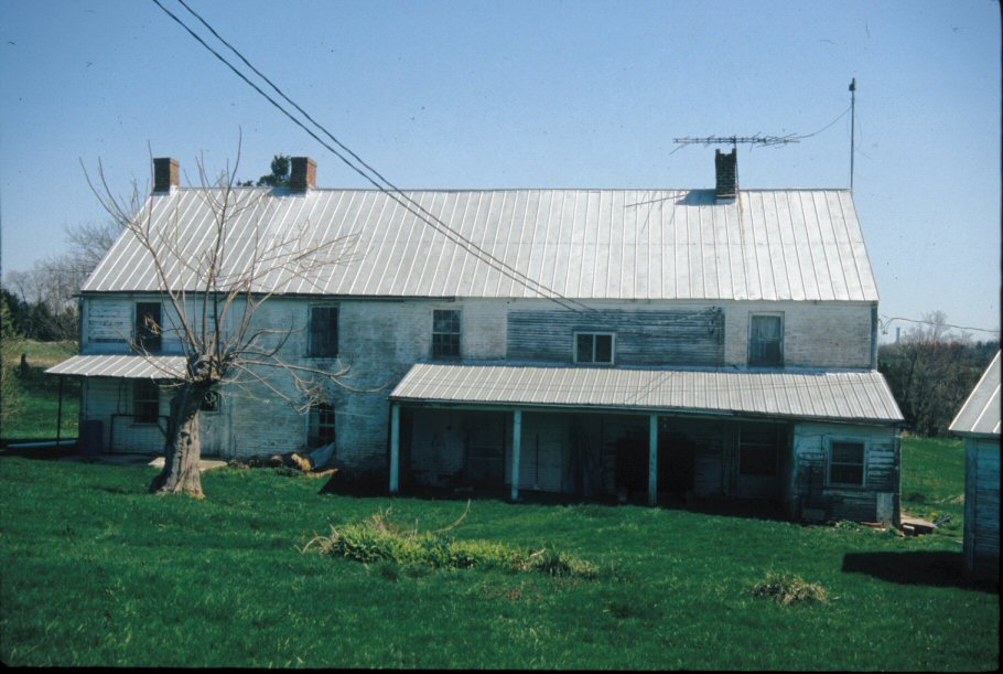 The Keefer-Brubaker Farm consists of a two-story six-bay by two-bay log and frame house which is partially encased in brick. Resting on a rubble stone foundation, the house faces southwest towards its farm buildings and the entrance drive. The north, east, and south, elevations have German siding, while the west elevation has German siding to the north, brick casing in the center, and novelty siding and German siding to the south. There are interior brick chimneys at the north gable end, between this first bay and its neighbor to the south, and between the two southernmost bays. There are entrance doors on the west facade in the first bay from the north, adjacent to a 6/6 sash window, in the third bay, although offset from its window above, in the next bay to the south, although the window above has been replaced by a two-pane horizontal-sliding window, and in the southernmost bay. The southern half of the southernmost bay, adjacent to the door, is covered by an enclosed partial porch. The remaining unenclosed porch roof spans the southernmost four bays on the west facade, and is supported by simple posts. The northernmost bay, containing the door and window, are also sheltered by a simple porch. All roofs are covered with standing seam metal. Part of the rear facade is recessed seven feet, with a two-story porch. The porch is accessed on both floors by a six-panel door in the east-of-center bay. Various windows have 2/2 or 6/6 sash. The house has a center-passage, single-pile plan, with two rooms on each side of the passage, being one room deep but two rooms wide. There is a short run of stairs on the north wall of the passage which ascends to the west. It has an open stringer with a broken field and a bead at the bottom edge. There are rectangular balusters and a thin, turned and tapered newel post. Below the stringer are horizontal beaded-edge boards and a door to a closet beneath the stairway. The north-center room has a very wide chairrail, and a closed-off fireplace in the north wall with a simple Greek architrave. To the east of this fireplace is a built-in cupboard with two one-panel doors and four shelves. This cupboard was apparently added later, as the chair rail and baseboard in the room run through it, with the chair rail painted dark olive green and the baseboard black where they are within the cupboard. West of the fireplace is a beaded-edge, vertical board door, which is now fixed shut. The west side of the fireplace itself contains a small built-in cabinet. The south-center room, which is the earliest portion of the house, constructed of logs, has a half-wainscot and a now-closed fireplace. Architectural evidence suggests that this room was raised to two stories at the same time the north-center room and the passage between the two were constructed, as the logs of the second floor continue across all three spaces. This likely occurred c. 1820-1850. The southernmost room has the same wainscot as the south-center, a stairway running to the north in the northwest corner, and the back of the aforementioned fireplace projects into this room. This chimney stack contains a built-in cupboard, indicating that the frame addition of this room was constructed at the same time the fireplace was added to the south-central room. Otherwise, this cupboard would have been on the exterior of the building. Portions of these sections of the house were at some point encased in brick. The far north end of the house, added in the late 19th or early 20th century, is divided into two rooms, the larger to the west. This contains a new exposed brick fireplace set east of center, with two terra cotta tiles in it that are probably re-used. The wood mantel has a simple shelf on two wide brackets. The frieze has applied foliate carving consistent with a date of c. 1890-1915. East of the fireplace is a closet with one door above another. There is one shelf in the bottom section and two shelves in the top. West of the fireplace is a vertical-board door leading to a cupboard under the stairs, and west of this is the entrance to the enclosed stair itself, which ascends to the east. In the small room to the east, the ghosts of shelves are evident along the west wall. Eight feet south of the house is a one-story frame summer kitchen, one bay by two bays, cove red in German siding. About 25 feet southeast of the house is a combination smokehouse/dry house, built of varying 5-, 8-, and 9-course common bond brick on a rubble stone foundation. Within is a frame for six drawers and several loose logs laid across the top of the interior, bearing hooks and exhibiting heavy smoke build-up. About 20 feet east of this outbuilding is a one-story, 1 x 1 bay frame springhouse. About 40 feet southwest of the house is a shop building that is one story tall and 1 x 1 bays, of frame construction with a parged rubble stone foundation. The barn is located about 180 feet west of the house and banked on the northwest, with a forebay that faces southeast. The dairy attached to the barn is one story high and one by two bays, constructed of concrete blocks. The hog pen is located about 20 feet south of the barn. It is a 1 1/2 story one by two bay frame structure with a rubble stone foundation. Also on the property are a tool shed, poultry house, and several more recent buildings.