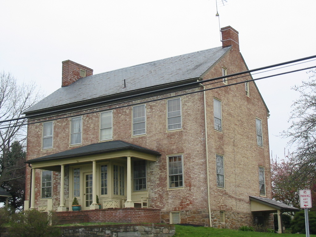 The main block of the Ludwick Rudisel Tannery House, which sits on a coursed fieldstone foundation, is constructed of brick laid in Flemish bond on the front (north) façade and American or common bond on all other façades. This section is five bays in length, two deep, with an original slate roof. Attached to the southeast corner of the house is a two-story, two-bay-long brick kitchen, with standing seam tin gable roof. Both sections have massive internal chimneys. The front (north ) façade features a 20th century one-story porch, supported by four Ionic columns on brick piers, which in turn is supported by a concrete base. The porch stretches across the central three bays. The six-panel front door with five-light transom is original, and is now covered by a modern glass storm door. All windows are original and contain 9/6 lights, and are double hung. A wooden box cornice with delicate frieze of alternating blank metopes and fluted blocks graces the eave line. The gable ends (east and west façades) contain identical fenestration and decoration. First and second floor windows are identical to those previously described and also have splayed brick lintels and wooden sills. Two attic windows, each with original 4/2 double hung sash, can be found in each gable, and light the attic space. The rear (south) façade is constructed in a different manner than the front façade. Here the coursed rubble foundation wall is built up to a one story level. In the first floor of the southwest corner can be found another original 9/6 window. Aligned above this window on the floor above is another identical window. Moving towards the center of the façade, a second 9/6 window is found. A third such window is found directly above the shed roofed enclosed addition (originally a porch and whose first floor now functions as a laundry and the enclosed entranceway to the rear of the house) which now intersects with the rear façade and the west façade of the brick kitchen. This enclosed addition is covered with weatherboarding, and contains modern 6/6 windows and a storm door, and has a shed roof with composition shingles. The brick kitchen sits on a stone foundation and is laid in American bond, with a cornice consisting of two rows of corbeled header bricks.