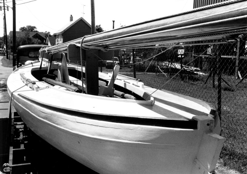 PATRICIA is a 27'-4" sailing log canoe in the racing fleet. She was built by Oliver Duke, a noted log canoe builder. She has a beam of 6'-4 3/4", a slightly hollow longhead bow, and a sharp stern. The canoe is log built in the Tilghman fashion, with carvel-fitted rising planks. Painted white, the canoe races under the no. 19 and is privately owned. PATRICIA has typical log construction, with rising planks carvel-fitted to the log bottom. Washboards from a half-deck and cockpit. She has a slightly hollow, modified longhead bow and a sharp stern. There is a centerboard and a rudder hung on pintles on the stern post. There is a long bumpkin extending out over the stern to help balance the canoe. The bumpkin has a fitted seat. Trestles inside the hull support the spars when they are taken down. The canoe is rigged with two unstayed masts with adjustable rake, carrying foresail, mainsail, and jib. In 1984 her rig was modified to include "wishbones" instead of sprits and she is the only boat in the racing fleet to use these. The sails are clubbed at the clew and made of dacron. The round bowsprit is rigged with a chain bobstay and wire bowsprit shrouds. PATRICIA's hull is painted white, with red trim on the cockpit coaming and some brightwork trim. Her name is painted in gold on white trailboards and there is a gold scrolled billet-head.
