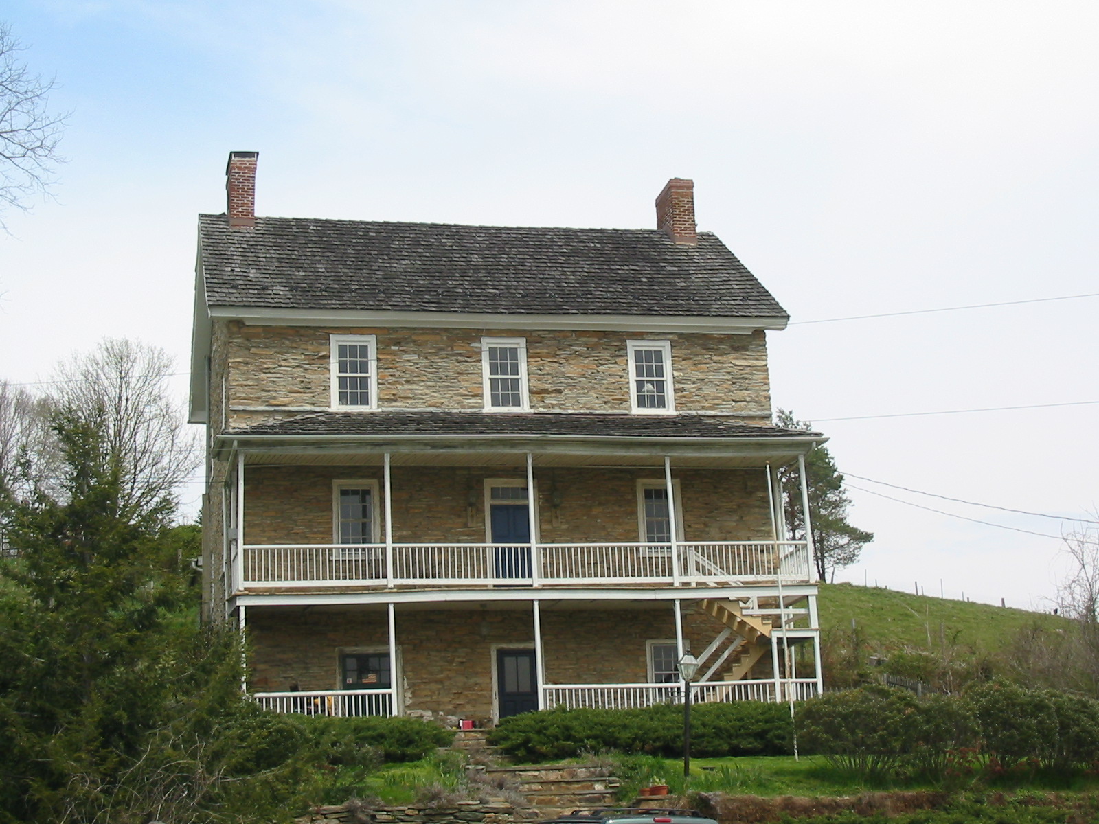 The stone house known as the Bowlus Mill House is part of an early 19th century farm complex which includes the house, a frame bank barn on a stone foundation, and a small frame shed. The house is a 2 1/2 story 3-bay stone structure with an exposed basement. Its bank siting and three-room plan reflect Germanic influence typical of the region in the period. The coursed rubble masonry exemplifies a distinctive local building tradition, featuring narrow courses of stone without keystones or arches at the window and door openings. Windows have 6/6 light sash. The house has three front entrances and one rear entrance. Two of the front entrances are at ground level in the exposed basement, and one is at the main story level, accessed by a two-level porch which spans the facade. The main entry has a four-light transom. A brick interior chimney rises from each gable end. The interior retains its original plan and detailing nearly intact, and features an array of well-crafted woodwork reflecting the stylistic transition from 18th to 19th century design, including a collection of Federal-style mantels with gougework and carved ornament. Also on the property is a c. 1950 concrete block dairy which tradition holds is located on the site of an early 19th century flour mill, and a deteriorated frame wagon shed.