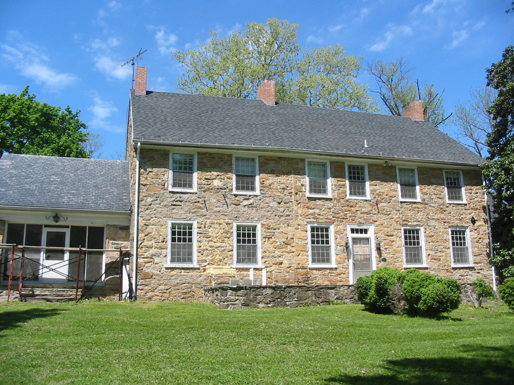 The Roger Johnson property, known as Bloomsbury, is a farmstead consisting of a two-part sandstone house dating from the 1780s with an early 19th century addition; a log barn and frame wagon shed; and remnants of log slave quarters located immediately behind the main house. Situated a short distance to the northeast of the main house is another small log house believed to have been part of the slave quarters grouping. Also on the property, located farther north along Thurston Road from the main group, is a 19th century frame barn. The main dwelling is constructed of local sandstone, and consists of a four-bay, two-story section, dating from the 1780s with a one-story kitchen wing extending to the east. The east wing accommodates a modern kitchen for the dwelling. Attached to the west end of the four-bay section is a two-story, two-bay addition dating from about 1800. Onto the west end of this addition was constructed a one-story stone and screen sun porch, dating from the 1930s. A stone deck extends out from the four central bays of the house and may have been the base for a former porch. The stonework appears to date from the early 20th century. Taken together, the house represents a balanced facade with a six-bay-wide two-story central block with one-story wings on each end. The oldest part of the house has a window, door, window, window pattern across the front with chimneys inside each end wall. The stones forming the walls are roughly coursed and fairly small in size, as typical of the 18th century. Windows hold 12/12 light sash at both the first and second story levels. Of the four bays, the two westernmost are grouped more closely together than the eastern bays. The front door has six raised panels beneath a four-light transom. Entrance lights on either side of the door are former carriage lamps. Inscribed in the window glass of the window immediately west of the entrance are the names of James Johnson, Roger's son, and his wife Emily with the date 1832.