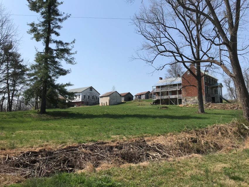 back and above the road. It consists of a brick house, stone and frame smokehouse, stone springhouse, frame bank barn, frame wagon shed, frame barrack, frame hog pen, and a log and
