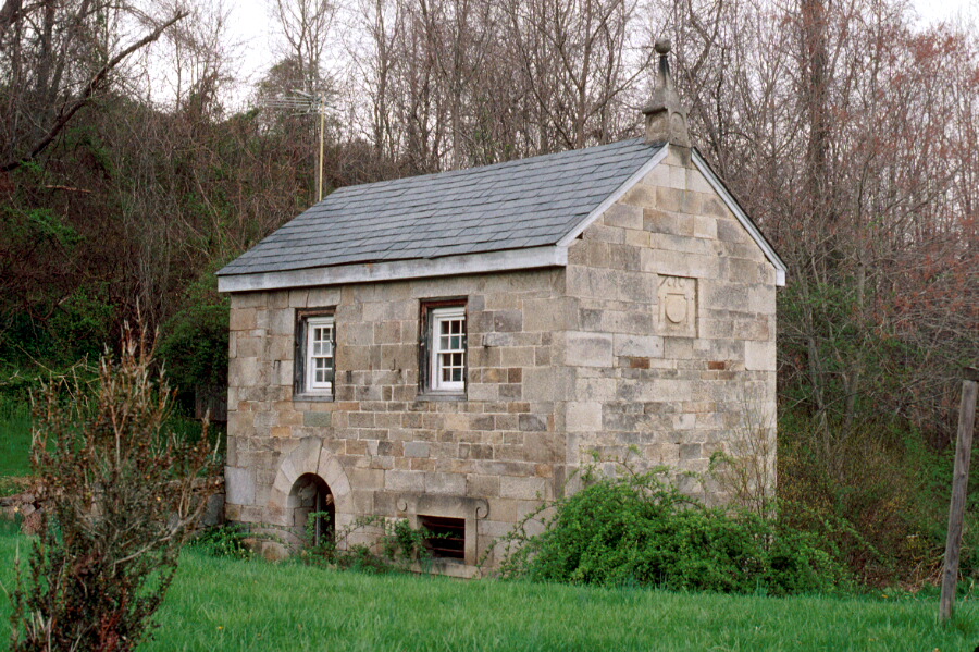 The balanced lines of the D. H. Springhouse, a little gray stone building set into the base of a steep hill, attract the eye at first glance, and then several exceptional details, one by one, hold the attention. This is a stone springhouse with a schoolroom above, 16' 6" by 23', with one narrow wall set into the bank over several fresh springs. It measures two bays by one. The gable roof ridgeline runs east-west. The quality of stonemasonry is notable. All corner stones and all stones facing west, south, and east, are perfect ashlar, precisely cut rectangles smoothly finished on all six sides. Even courses fit the quoins. Lintels and sills bear traces of finely notched chisel lines, parallel or radiating to a perfect curve at each end. Entry to the schoolroom is through a wide doorway a few steps above the high ground at the west wall. Two windows with pegged oak frames, double hung with 6/6 lights, are located in the north and south walls. Shutter hinges and hooks are still in place. Entry to the springhouse below is through a wide round arch in the south wall, made of nine stones, four on each side of the perfect keystone. On this level are two rooms. The first, smaller, is the churn room with a small fireplace in the northwest corner, used to keep the butter and cheese warm enough in winter. The springhouse, about 14' square, had underwater shelves of stone on which crocks of milk and cream were set. Here the swirling springwater kept them cook but above freezing. Dairy products and meats and other perishable foods for the family and some of the young livestock were kept for a day or so this way. Features of the stonemasonry skill include three window lintels with a rams-horn pattern finely etched with radiating chisel lines. The east end wall has a large stone plaque with scrolls and columns in low relief around a raised oval, gracefully inscribed "D. H. 1816." The peak of the east wall is topped with a square stone base that supports a tapering four-sided arm under a tiny Ionic capital. The capital supports a one-inch cube centered under a perfect sphere which measures about 6" in diameter. All of this is formed from a single stone.
