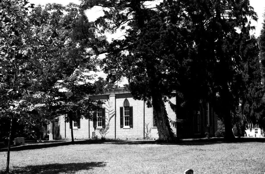 Christ Church I.U. is a small brick structure, basilican in plan, with a narrower sanctuary appended to its western end. The building is constructed entirely of common bond brick. The entrance facade which is the eastern gable end is three bays wide consisting of a centrally placed, pointed arched doorway flanked by two pointed arched windows. The recessed double doors are surmounted by a wide wooden lintel and arched transom. Above the door in the center of the gable is a bullseye window. The windows and door are provided with louvered shutters which open side to side and fixed pointed arch louvers at the top portion of the arched openings. Sills of Port Deposit granite elaborate window and door surrounds and project slightly from the wall plane. Brick pilasters are located at either side of the facade and join at the corners with pilasters at the end of each longitudinal face of the building. The southern and northern facades of the building consist of four equal-sized bays separated by five brick pilasters terminating in wooden corbel caps and each containing a pointed arch window. All windows are double hung with 6/6 lights surmounted by lanceted sash. A bracketed cornice with blank frieze runs the length of the building. Chimneys are located at the central pilaster of each longitudinal facade. A lower asymmetrically gabled chancel with a shed-roofed extension on the west facade houses the sanctuary and the sacristy, the latter of which is accessible through a lancet arched doorway with corresponding Gothic detailing in the transom. At the center of the west wall and corresponding to the altar position in the interior of the sanctuary is a double lancet window protected on the exterior by paneled shutters. Glazed headers are used to trim the segments of the pointed arch of the window surround and also appear in the letters "I" and "U" located in either side of the window at the spring line of the arch. A smaller similarly detailed window located on the north wall of the sacristy also illuminates the apse. Another pointed arched window smaller still and closer to ground level pierces the west wall of the sacristy. The Sexton's house at Christ Church dates from the period of the earlier church and consists of two adjoining sections, one brick and one stone, both one story high with dormers. The brick section, laid in common bond upon a stone foundation, is three bays in length. The westernmost of the three windows on the building’s south facade replaces what was once the principal entrance door. The north side of the roof bears a single 6/6 sash shed-roofed dormer above the easternmost which corresponds in configuration to the two dormers above the east and west outside windows on the south facade. The east gable end frames a large interior wall fireplace whose chimney, covered in stucco, rises above the roofline. The frame section, a subsequent clapboarded addition to the west gable end of the brick dwelling, contains on the south facade what is now the entrance to the building, a doorway flanked on the west side by a small window and accessible by a flight of wooden steps. Another shed-roofed dormer is placed atop the entrance bay. The north facade is articulated in the same fashion as the south: door flanked on the west side by a window and surround with the same shed dormer. The boxed cornice which overhangs the longitudinal sides by about 13" unifies both facades. The entire building is painted white with some glazed bricks showing through beneath the paint.