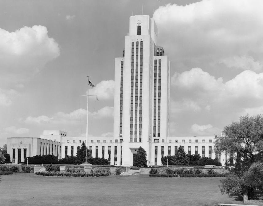 The National Naval Medical Center at Bethesda, Maryland, was built during the early years of World War II to house the U.S. Navy's principal center for the practice and dissemination of medicine related to the needs of the naval service. The importance which the government attached to this center for education and research in naval medicine is reflected in the evolution of the complex's design which proceeded from rough plan and elevation sketches by Franklin D. Roosevelt on White House Stationery to an in-house Bureau of Yards and Docks design effort executed under the close supervision of the noted private consulting architect, Paul Philippe Cret. The 20-story tower block with its two L-shaped wings enveloping a lawn that slopes down toward Wisconsin Avenue on the east constitutes a landmark of the Bethesda area in the physical sense of the word. In 1878 the navy established the school for medical officers, and in 1902 the school moved into the Naval Observatory in Washington. Gradually a complex developed which included a hospital, various medical schools, and a medical library. In 1937 Congress acted to fund construction of a new medical center, and Franklin D. Roosevelt selected the site. Significant medical research at Bethesda includes the acrylic eye, grafting techniques of bone and blood vessels, radioactive treatment of bone tumors, facsimile limbs, and a wide variety of other surgical, medical, and psychiatric techniques.