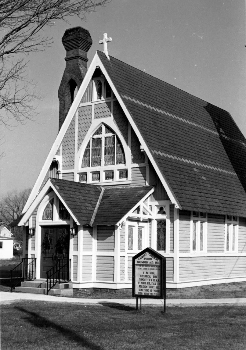 Christ Church is a modestly scaled frame church and adjacent bell tower, constructed in the Queen Anne style. The present church building, as constructed in 1880, consists of a rectangular frame structure with a steep slate roof, lofty Victorian chimney, and simple but pleasing stained glass windows. The exterior walls exhibit Victorian decorative work executed in cedar shingles and German siding. The facades are divided into panels, defined by chamfered posts and horizontal rails, painted a soft grayish-white. The infill is alternately composed of horizontal or vertical siding and patterned shingles; these are painted a bluish gray. The result is an array of varying colors, textures, and patterns, all unified by the more rigid framework of posts and rails. The bell tower directly adjoins the east facade of the church and is similarly treated, although the infill does not include shingle work, but is composed entirely of narrow horizontal siding. The attenuated pyramidal roof is covered with shingles rather than slate and rests atop an open framework of chamfered posts and arching Stick-Style braces, enclosed by a low railing. The interior of the church is quite dramatic. A lofty, steeply pitched ceiling rises above the congregation, supported by open, Stick-Style trusses. There are three of these, dividing the interior of the building into four bays. The trusses spring from heavy, chamfered posts in the side walls. Large brackets support heavy tie beams, a pair of queen posts rise from the tie beam to a high collar beam, and a braced king post rises from the collar to support a ridge beam. Great curving braces form Gothic arches below the collar and, minus the tie beam, the overall effect resembles a hammer beam truss. All of the timbers are chamfered, and the ends of the braces are scrolled. The ceiling is of narrow, beaded boards laid vertically from ridge to eaveline an secured to the top plate, two sets of purlins, and the ridge beam. The remainder of the interior is equally fine, with Gothic-arched, stained glass windows arranged in three pairs along each side wall and larger arched windows in the upper south gable and behind the altar in the north apse. There are smaller windows on either side of the entrance vestibule and in the transepts. Interior woodwork consists of a heavily molded cornice, chamfered window frames, and a simple chairrail surmounting a dado paneled with narrow, beaded boards. The dark, rich color of the woodwork contrasts with the white plastered walls and soft, muted colors of the stained glass.
