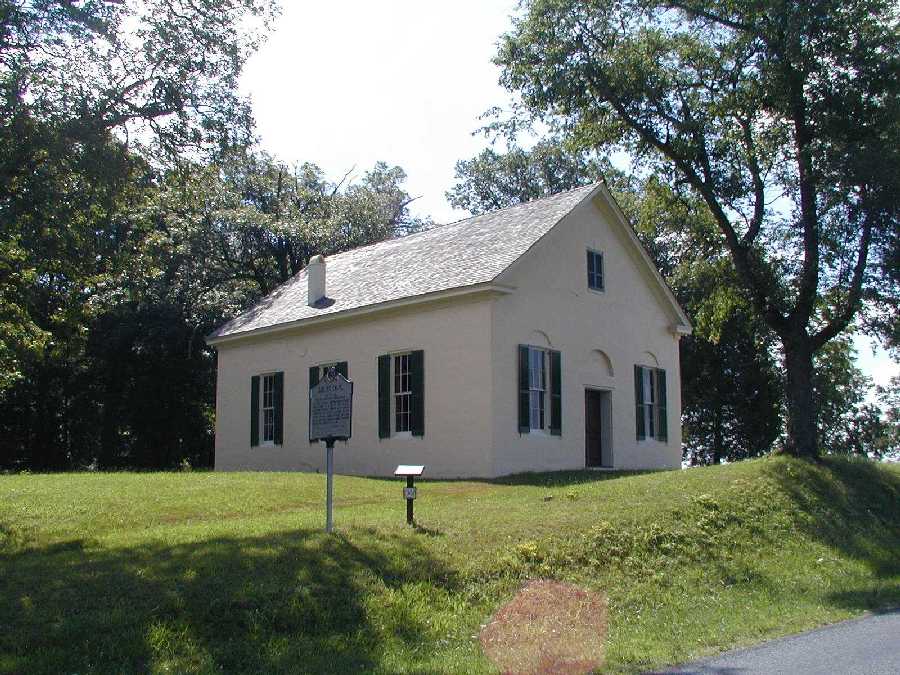 Built in 1783, Dudley's Chapel is a simple brick structure with a moderately pitched gable roof. The west gable, facing the road, is the principal facade, while the altar and pulpit are located at the east end of the church. This is a very simple and unpretentious building, made even plainer by a series of renovations and repairs undertaken periodically throughout the 19th century. The most significant change to the exterior of the building was the application of a coat of stucco in 1883, covering all of the original brickwork, and also hiding evidence of alterations to the windows and one door. Although the bonding pattern is not known, it seems probable that it was laid in Flemish bond, perhaps with random glazed headers, but without a watertable or belt course. On the west gable, double paneled doors are flanked by a tall 6/6 window on each side. Each of these openings has a recessed relieving arch, the most significant decorative feature of the building. In the upper gable there is a small window concealed by louvered shutters. The north and south facades are very plain, with three tall 6/6 windows symmetrically ranged along each wall. An interior brick stove chimney pierces the roof on each side between the east window and the center window. The east gable is equally plain, with a single 6/6 window at each corner, flanking the pulpit. The north window was originally a door to the vestry, but this was closed in and changed to a window in 1900. There is no window in the upper gable at this end. Several cast-iron tie plates have been secured through the walls; some of these are S shaped, others are plain square plates. A box cornice with crown mold and bed mold extends along each facade, returns at the gable and is carried up the eaves. This presumably dates to 1856, when the roof was rebuilt. A small cemetery lies to the rear of the chapel.