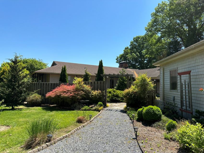 Fond Hope is a one-story, frame, mid-century modern, single-family dwelling designed by Delaware-based architects Victorine du Pont Homsey and Samuel Homsey and was completed in 1959. The pair, known professionally as Victorine & Samuel Homsey Inc, also designed an addition to the house on its north end that was completed in c. 1970. Fond Hope sits on a concrete foundation and employs low, horizontal, modernist massing. The building features a generally rectilinear floorplan, augmented by several projecting blocks that include both historic and contemporary additions, along with porches, an enclosed balcony, and a veranda. The main original structure has a low-pitched combination hipped and gabled roof with overhanging eaves supported by narrow wood piers resting on stone footings. The entryway, located at the southern end of the west elevation, is sheltered by a non-original cross-gabled projecting roof. The entire roof is clad in asphalt shingles punctuated by a broad internal brick chimney topped by a hipped metal cap. The exterior walls are clad in painted wood shingles. Fenestration is irregular, featuring a combination of casement and fixed windows of various sizes. The east (rear) elevation, facing Snug Harbor, is characterized by large expanses of glass, with groupings of casement windows, sliding glass doors, and transom windows designed to maximize views of Snug Harbor. Stylistically, the exterior of the house draws inspiration from traditional Japanese architecture demonstrated through the use of wood cladding, long verandas, posts that appear to float on top of natural fieldstone bases, and a porous relationship between interior and exterior spaces. This influence carries through to the interior of the house with the use of sliding screens (shoji), sliding partition doors (fusuma), and ornamental tie beams (nageshi).