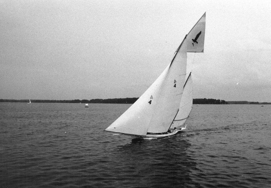 ISLAND BIRD is a 27'-4" sailing log canoe with a racing rig, a sharp stem with a longhead bow, and a sharp, raking stern. Log-built, she is one of the smallest boats in the active racing fleet, with a beam of only 5'-6 1/2". The canoe was built in 1882 in Tilghman, Maryland by William Sidney Covington, one of the most noted of the early racing canoe builders. The boat is privately owned by his descendants and has been racing every season since 1949. She has a white hull and a distinctive white kite with an osprey on it. The canoe has typical Tilghman-style log construction, with carvel-fitted rising planks and a smooth sheer with no sheer rails. There are half frames and sawn hanging knees supporting her washboards, which form a half-deck and carry short cleat rails midships. The sharp stem has a modified longhead. A short entry leads to a long run with a long, sharp, raking stern on which the rudder is hung outboard on pintles. A short bumpkin with a solid wooden backrest overhangs the stern. The canoe has a centerboard placed well forward and carries springboards for racing. There are solid stern sheets aft of the mainmast step and thwart. The rig consists of two unstayed masts--a 36' foremast and a 25' mainmast--a mainsail, foresail, and jib. These are set into square chocks in thwarts. The bowsprit, curved down towards the water, is set up with standing rigging--a bobstay and two shrouds as well as wooden braces on the longhead--which counteract the force of the large jib. The main sails have clubs and sprits and the jib has a club on its foot. ISLAND BIRD carries among her light racing sails a distinctive kite with an osprey. The canoe is half-decked with a squared-off foredeck and wide washboards painted light green, lined with a white coaming. When not set up the masts are carried on trestles in the cockpit, as is other racing gear. The hull is glassed over and painted white, with the name ISLAND BIRD in black letters on the hull. Her longhead is painted white and is undecorated, but carries the ends of wooden braces leading aft to the hull.