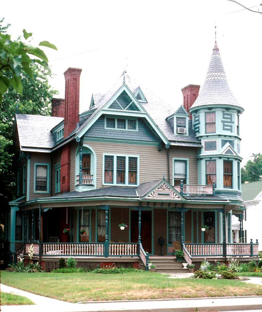 Singularly outstanding among the Queen Anne dwellings that define Salisbury's Newtown neighborhood is the elaborately detailed Gillis-Grier House, named after the two inter-related families that held title to the property between 1896 and 1975. While this hyphenated name recognizes the property's long-term owners, the impressively designed and crafted house was assembled for Salisbury merchant James Cannon in 1887. Dominated by a three-story tower with a conical roof of patterned slate, the sprawling hip-roofed dwelling includes multiple pavilions, bay windows, and a variety of gabled dormers that provide a variety of form that is enriched with varying styles of exterior siding and applied decorations. The lively exterior is matched by equally rich interiors of late-19th century design. Parquet floors on the first floor are combined with cabinet style mantels with tiled fireboxes. Spotted throughout the house are colored glass windows that provide another rich source of interior decoration to the many-roomed interior.
