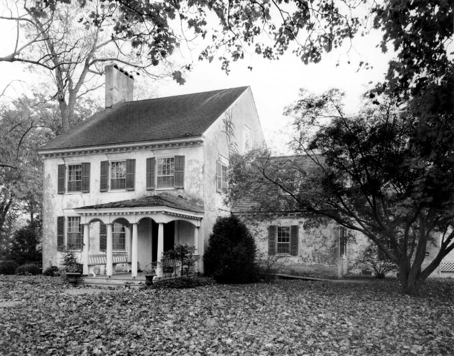 Burley Manor is a Federal-style brick house of the 1830s. Facing west the main section is three bays wide and two rooms deep with the door, surmounted by a fanlight, in the south bay. Protecting the entrance is a one-bay porch supported by round columns with sunbursts decorating the square capitals. Between the capitals are arches with pointed teeth on the edges. There are wood benches on both sides of the porch. The two first-story windows have 12/12 lights, while the three in the second story have 12/8 lights. Above each window is a recessed flat arch. All the windows have louvered shutters. There is a modillion cornice on the house and porch. The north end has two 12/12 sash windows near the center of the first story and two 12/8 sash windows directly above. In the gable are two 6/6 sash windows flanking the large flush chimney. The south end has a window in the first and second stories of the west bay. Beneath these windows is a cellar entrance. Centered in the gable is a 6/6 light window. Extending from the eastern three bays is a 1 1/2 story dining room wing, one bay wide and one room deep. Centered in the west facade is a single 12/8 light window above which is a dormer in the gable roof. The modillion cornice matches that of the main house. The south end of this addition has 12/8 light windows on the first story, one each in the center and west bays, and one 6/6 sash window in the gable to the right of the flush chimney. This wing is also stuccoed and has recessed flat arches above the windows. Perpendicular to the dining room wing is a 1 1/2 story kitchen wing. The west gable end has one 6/6 sash window in the first story with a second above it in the gable. The south side is three bays wide with the door in the center bay and 6/6 sash window in the other bays. A porch, covering this side, forms a catslide roof. The east end has a large flush chimney. Extending across the south end of the main section is the entrance hall and stair hall separated by a fluted elliptical arch with fluted key supported on fluted pilasters. The stairway, in the east end of the hall has two square balusters per tread and decorated step ends.