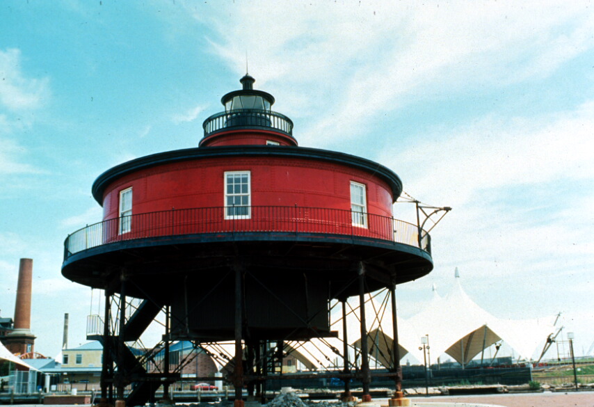 Built in 1856 at the outer entrance to Baltimore's harbor near Riviera Beach in Anne Arundel County, the Seven-Foot Knoll Lighthouse was the second screwpile structure built by the U.S. Lighthouse Service. The present structure contains some elements of the original cast iron structure and the house dates from the late 19th century. The light is historically linked to the development of the Port of Baltimore and sits beside one of the busiest shipping lanes on the East Coast. Technologically, the screwpile form illustrates Amercians' ability to produce large cast iron foundry castings, the same development that produced cast iron architecture. In the period 1835-1860, Baltimore was a leading national center of this new metalworking technology and of new marine engineering techniques. Seven-Foot Knoll is arguably the most significant of the remaining screwpile structures. It is now located on Pier V in Baltimore's Inner Harbor.