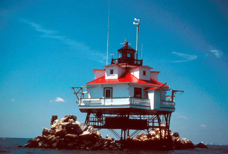 The original light is intact, and the building has sustained only minor alterations. This lighthouse was the last of the manned screwpile lighthouses in Chesapeake Bay. The screwpile type lighthouse was initially designed and built in 1838 by Alexander Mitchell, an English engineer. Ten years later, this design was first built in the United States on Brandywine Shoal in the Delaware Bay. The screwpile method of anchoring a lighthouse incorporated pilings tipped with two blades arranged in a screw fashion. The method was simple, effective, inexpensive, and appropriate for the often shallow, muddy, or sandy bottom of the Chesapeake Bay. Between 1854 and 1908, 42 screwpile lighthouses were constructed on the Bay. All the structures were basically alike, tending to vary only in size, number of pilings, type of bracing, and style of superstructure. The first lighthouse at Thomas Point shoals was constructed in 1825 on land at the end of the Thomas Point peninsula which before severe erosion extended much further into the bay. Due to its faulty construction, this lighthouse was rebuilt in 1838 by Winslow Lewis. After 44 years, complaints were made that the location of the lighthouse made it of little use at night and in foggy weather. While a new caisson-type lighthouse was considered, a less expensive screwpile lighthouse was selected. The present screwpile lighthouse at Thomas Point was built on five acres of land in the Bay conveyed by the State of Maryland on October 28, 1874. It became fully automated in September of 1986.