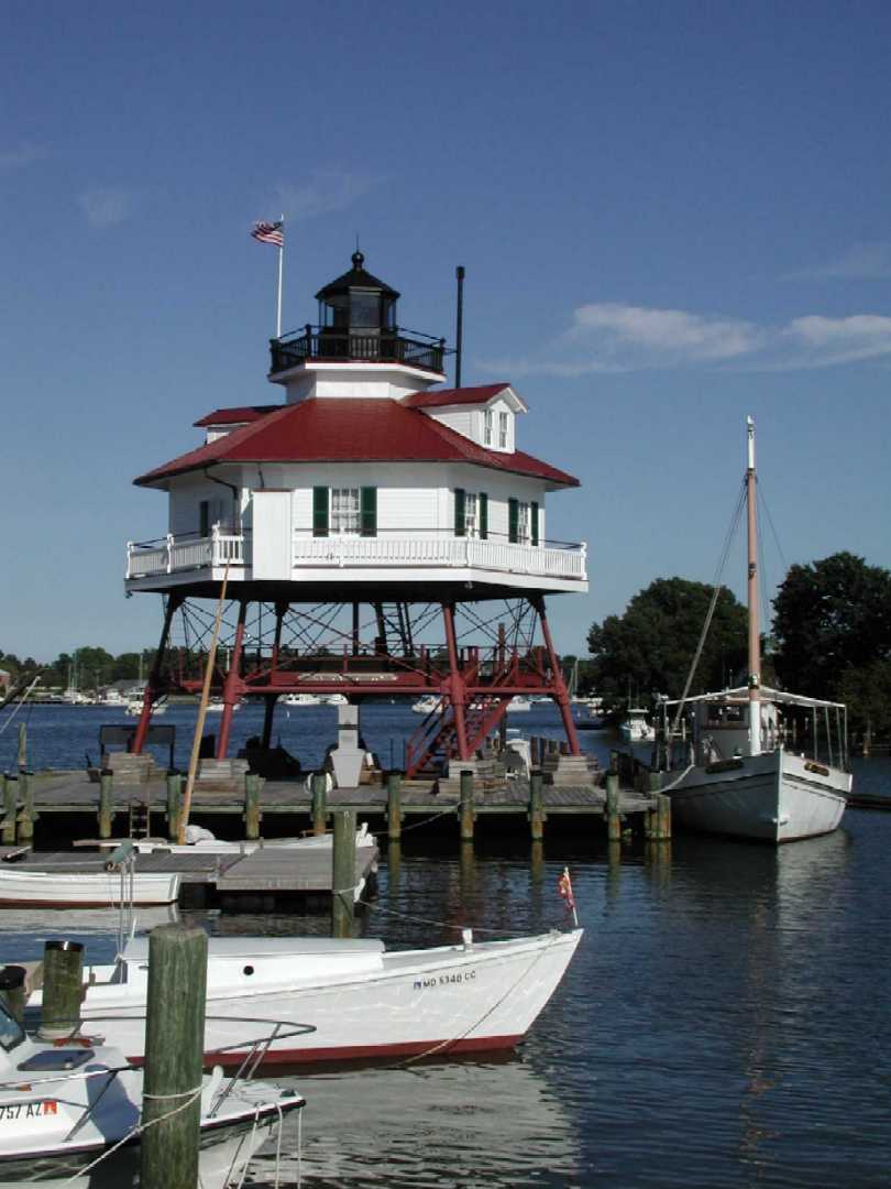 The Drum Point Lighthouse is one of four remaining screwpile lighthouses on the Chesapeake Bay. Any lighthouse, and particularly a historic structure, is fast disappearing as navigational equipment due to the modern communications channels and satellite-related aids. The Drum Point Lighthouse and other screwpile lighthouses flourished on the Chesapeake Bay from the second half of the 19th century to the mid 20th century, serving as important navigational aids. Although the Drum Point Lighthouse, constructed in 1883, has escaped demolition, its original light, which required a resident attendant, was automated in 1962. The first screwpile lighthouse on the Chesapeake Bay was erected in 1855 in Virginia waters. In the mid 19th century these practical lighthouses began to replace light ships, which had been the principal navigation aids, on the Bay. The United States Lighthouse Board, a branch of the United States Treasury Department, built the Drum Point Lighthouse on five acres in the mouth of the Patuxent River. The State of Maryland conveyed the property on which the lighthouse stood to the Federal government on February 15, 1883. This transaction followed the provisions of an 1874 Maryland law that provides for the transfer of State property to become Federal property for the purpose of erecting lighthouses and other navigational aids. Alexander Mitchell (1780-1868) invented the screwpile principle. His idea was first used in 1838 at the Malpin Sand Lighthouse at the mouth of the River Thames, England. The principle was later applied to bridges, viaducts, and piers. The screwpile principle is well suited to southern bodies of water and to soft bottoms.