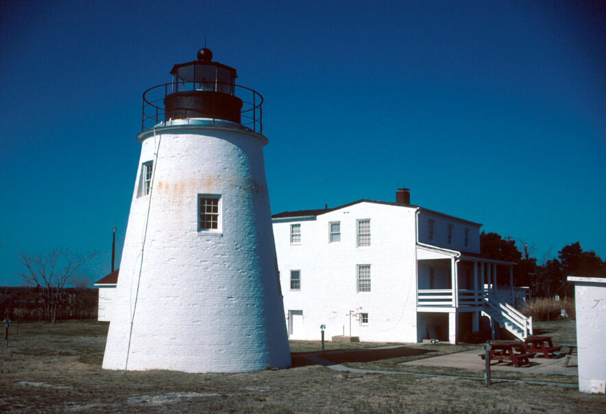 Description: The Piney Point Coast Guard Light Station consists of a conical brick light tower and a brick keeper's quarters with a shallow gable roof. The lighthouse is a conical structure of brick painted white, 30' high. The focal plane of the light was 34' above the base. A 9-sided cupola constructed of metal with rectangular glass panes surmounts the brick tower. This is covered with a standing-seam metal roof capped with a large ventilator ball. An iron railing, 40" high, runs along the edge of the cantilevered masonry parapet walkway. Access to the cupola is gained by means of a circular wood stairway which occupies the entire core of the structure. The stairwell is lit by 6/6 sash windows. Interesting early iron hardware remains on the heavy entrance door. Though the Fresnel lens has been removed, the appearance of the structure is essentially as constructed in 1836. The keeper's quarters is a brick constructed building, 34' x 20', with a 15' x 11' wing of stuccoed frame construction. Two stories over a full basement, the keeper's quarters has undergone radical interior alterations which have obliterated original conditions. The building has a shallow gable roof of standing-seam metal. A one-story porch extends across the northwest (entrance) facade. As constructed by John Donahoo in 1836, the keeper's quarters was a tiny one-story brick building of three rooms. This was enlarged in 1884 by the addition of a second story. At one time, the property also included a fog signal house, an oilhouse, a storehouse, and an outhouse. Significance: Constructed in 1836, Piney Point was the first lighthouse built on the Potomac River. John Donahoo, constructor of several lighthouses in the Chesapeake Bay area, erected this structure at a cost of about $5,000. The property on which the lighthouse was constructed was acquired in fee simple from Henry Suter and Charlotte Suter, his wife, by warranty deed dated 24 December 1835 for $300. The lighthouse was erected to replace a lightship which had been in operation at the site since 1821 to warn mariners of dangerous shoals at Piney Point and across the Potomac at Ragged Point. In 1855, the old reflecting apparatus--ten lamps and ten 15" reflectors with a visibility of 10 miles--was replaced with a more efficient 5th-order Fresnel lens, increasing the light's visibility a full mile. In 1880, a 30' bell tower was added to the station to protect mariners from fog. This fog bell had an automatic striking device. A square frame tapering tower with 4/4 sash windows in gable-roofed dormers piercing the sides, the fog bell tower was destroyed by Hurricane Hazel in 1954. Piney Point was a busy recreation area for Southern Marylanders between 1820 and 1910. President James Monroe maintained a cottage at Piney Point, known as "The Summer White House." A hotel was in operation until closing due to damage sustained during the hurricane of 1933. Piney Point Light continued as a manned station under the lighthouse service until the incorporation of that service into the Coast Guard in 1939. Piney Point became a testing range for torpedoes during World War II. Following the war, the Naval Torpedo Test Center and Range was decommissioned and the base became known as the Pane Hall Center of the Harry Lundeberg School of Seamanship. The Coast Guard discontinued the light in 1964. The property is now owned by the St. Mary's County Department of Recreation and Parks and is open to the public.