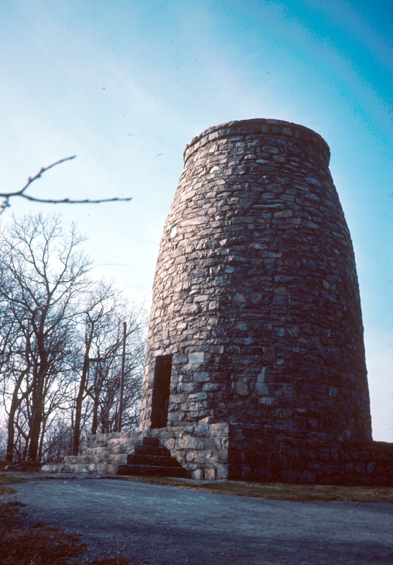 Washington Monument is situated atop Monument Knob, originally called "The Blue Rock," a 1550-foot peak of South Mountain, located on the dividing line between Washington and Frederick Counties, 1 1/2 miles north of Alt U.S. 40. The monument is 24 feet in diameter at its base, and 40 feet high. Its tapering design is said to be that of a Revolutionary War cannon, but is often referred to as a "jug" or a "milk bottle." The wall is composed of huge stones, many weighing upwards of a ton. A doorway on the east side of the structure leads to a stairway that ascends to an observation deck at the top. A series of white marble markers document the monument's construction on July 4, 1827, and restorations in 1882 and 1936. The original builder's stone inscribed "Built by Isaac C. Lutz 1827," was removed and in private ownership. The Appalachian Trail, which extends 2000 miles from Maine to Georgia, passes directly east of the monument and is used by visitors going to and from the monument.