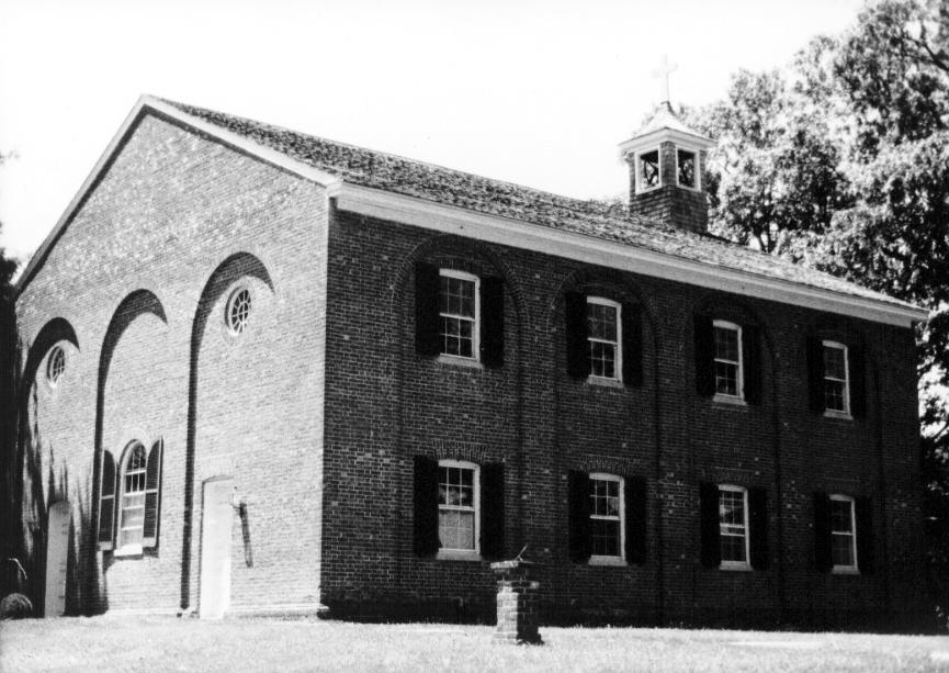 This Georgian structure is of Flemish bond brick with random glazed headers. It is three bays wide and four deep, with a gently sloping gable roof. All the walls are composed of a series of round-headed brick arches recessed to the ground level. In these panels are set the windows and doors on two stories. The windows are all 6/6 with segmental arches and old shutters. The watertable is composed of a flat projecting brick, topped by a cyma reversa mold, topped by a cyma recta. The interior walls of the church are a series of square piers and recessed two-story round-headed arches into which the windows are set. The north and south walls have galleries, each supported on five square piers. The east and the west walls have round windows on the second story level. The box pews have simple paneling. The church presents a well-restored, pleasing appearance.