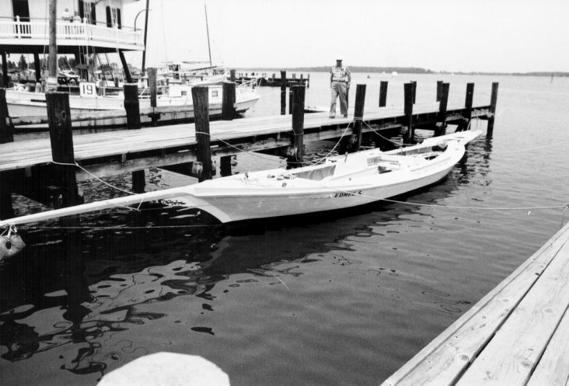 EDMEE S. is a 48'-4" sailing log canoe owned by the Chesapeake Bay Maritime Museum and sailed in canoe races on the Eastern Shore. Log-built with carvel-fitted rising planks, in the Tilghman style, she has a 31'-7" length on deck and a beam of 7'-7". The canoe was built in the 1930s by noted builder Oliver Duke but never raced until acquired by the Museum in 1980. She now races under No. 22, with a crew of 9 to 11 people. EDMEE S. was built of 5 pine logs, topped with carvel-fitted rising planks in typical Tilghman fashion. She has washboards, forming a half-deck around the cockpit, set on cut-out, sawn hanging knees, and partial stern seats. Double-ended, she has a sharp, somewhat hollow bow with a modified longhead and a sharp, steeply raking stern. The rudder is carried outboard at the stern on pintles. A wood outrigger, or bumpkin, painted white with a metal backrest, extends about 4' over the stern. The canoe has a certerboard set well forward, let into the squared-off bottom log. Her overall shape reveals a rounded chine with little or no flare to the topsides. The canoe is rigged with two adjustable masts, set raked well aft by means of chocks. The foremast is set into a square cut out of the foredeck, while the mainmast is stepped through a thwart reinforced with a vertical bracing frame and an upper horizontal brace. Sails are of white dacron and include a fore, main, jib, and kite. The boat sometime carries a striped staysail but does not have a square sail. The bowsprit, square and tapering, is rigged with a wire bobstay and bowsprit shrouds. The boat carries three springboards for balance when sailing. There are cleat railings on either washboard.