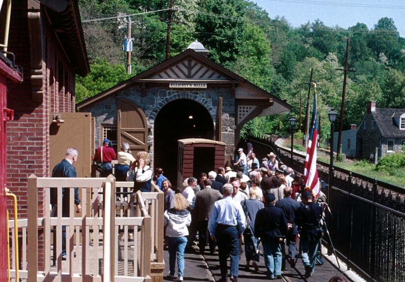 Ellicott's Mills was the terminus of the first 13 miles of commercial railroading to be constructed in this country. It is believed that the stone station itself was engineered and designed to be part of the Oliver Viaduct which overpasses Frederick Road (the Old National Pike). The cornerstone for the Viaduct was laid on July 4, 1829 and it abuts the station. The exterior of the wall of the stone station ties into a stone retaining wall which parallels the Main Line track in a southerly direction toward Baltimore. The Railroad had planned to use Ellicott's Mills as a Depot and a portion of the first track laid was laid in Ellicott's Mills having been completed as early as 1828. The station was planned for use as the office of the Superintendent of Construction and it was from this office that a great deal of the construction for the first 13 miles was supervised and after completion this office was used for many years as the Superintendent's Office as the Railroad pressed westward. Public response to the railroad was tremendously successful and the trip from Baltimore to Ellicott's Mills become a must. Although the railroad had not anticipated passenger service, it suddenly found this to be an instant success and business flourished. During this period the Ellicott's Mills Railroad Station was the scene for arrival and departure of Presidents, political aspirants, foreign dignitaries, and just plain people interested in the thrill of a ride on the iron horse. This is the only station known to still be in existence which was designed to accommodate the servicing of engines in this manner. Its use as such was shortly to become impractical because of the rapid growth of the size of steam engines and it appears that early in the 1840s the doors were closed off and the building was no longer used in this manner.