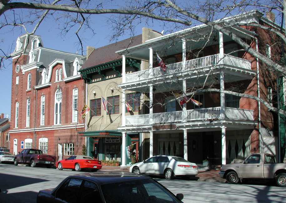 The Chestertown Historic District is the older section of Chestertown. It includes the central business district which is dominated primarily by late-19th and early-20th century commercial structures and includes a late-19th century courthouse; the river front which is lined by several 18th and early-19th century Georgian and Federal houses with several early-20th century houses across the street; several garages and 19th century low-income frame houses along Cannon Street, the middle class residential areas along Maple, High, and Washington. Sections of the Washington College campus are included in the northern area. Intrusions consist primarily of new or greatly altered buildings scattered throughout. The Chester River Bridge is not included in this nomination. In the area around High Street, Georgian, Federal, Gothic Revival and simple early tradesmen's dwellings predominate. The Washington Avenue area consists of large Victorian, Queen Anne, and Shingle Styles, with additional vernacular utilitarian homes and smaller 20th century bungalows. Washington College structures erected in 1844 and 1854, Middle, East, and West Halls, are the earliest remaining, with Middle being a Greek Revival building and East and West stylistically designed to compliment it. Reid or Normal Hall, across Washington Avenue, was originally a late Victorian dormitory with mansard roof, built in 1896. In 1929 a Mt. Vernon portico and additions were added, and later, stair towers were erected on each end. Other College buildings were erected from 1918 to 1970 in Georgian Revival are contemporary styles. Near the business district, along High and its cross streets, structures are constructed directly on the sidewalk with yards existing generally to the rear. The Washington Avenue and nearby residences are set back with landscaped yards surrounding the homes; while the college buildings center generally around an open green. Commercial use is generally located on a two block length of High Street, and two blocks, to the south, of Cross Street with residential units often located above these businesses. The commercial activities of Chestertown are housed primarily in vernacular buildings of modest scale, of types as required for their daily activities of the craft, trade, or sales, or social functions. The treatment of the facades, signs, and other public representations of the housed commercial activities have changed through time and are still changing, but the basic scale of the commercial streetscapes remains unchanged within the vernacular format. The inclusion of the several buildings of more studied design and architectural merit within the commercial areas does not here create unexpected or extreme contrasts of design or scale, and these inclusions tend to compliment the more numerous vernacular buildings in their relationship to the streetscape and to the day to day activities of the commercial areas. As one moves away from Water Street; along High Street, residences become more of those for the less affluent of the 18th and early 19th centuries, with later homes interspersing where possible and development on side and back streets. The Washington Avenue development opened a new neighborhood to those with ample funds to erect large, comfortable Victorian and later vernacular utilitarian residences. Streets off the Avenue developed again for less expensive and smaller residences of the same and later periods.