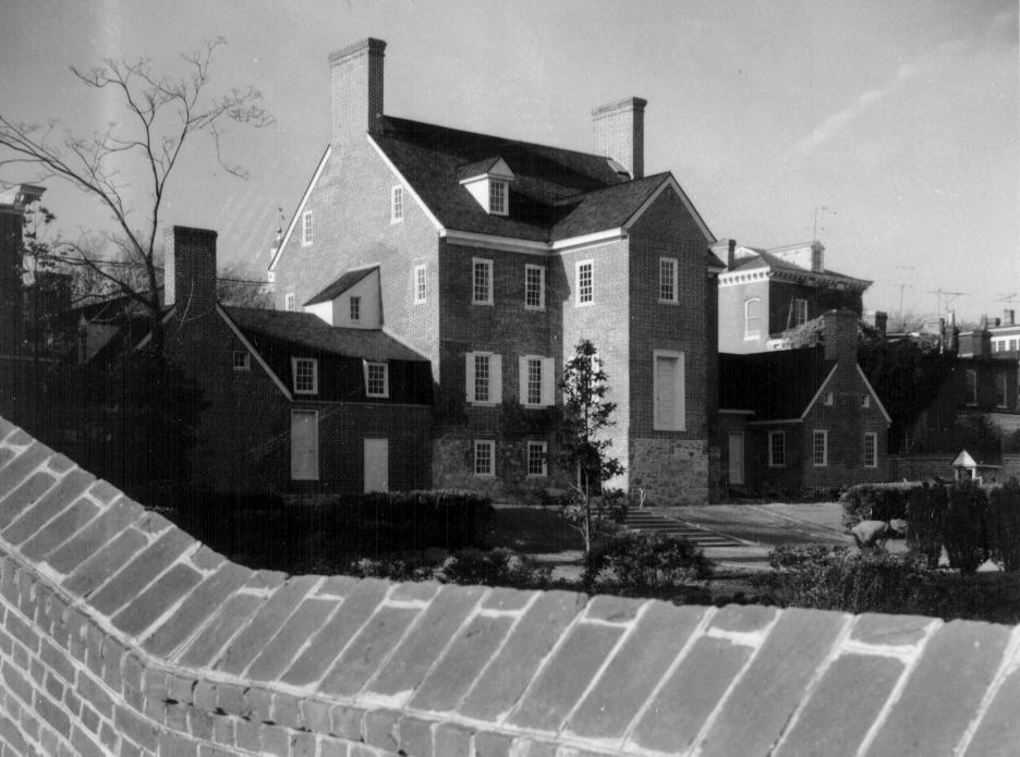 The walls of this massive-five-part Palladian-style structure are brick laid in Flemish and English bond while the foundation is a mixture of rubble stonework and brick. The crevices between the stonework are set with a pattern of small black pebbles called "galleting." The large 2 1/2-story five-bay-long center section, covered by a steep gable roof containing five gable-roofed dormers on the south (front) and two on the north (garden) side, is connected to two one-story dependencies by small brick hyphens. The front (south) facade is laid in all header bond with a belt course of Flemish bond with glazed headers. The side walls are laid in Flemish bond, the gables of English bond, and the garden facade almost entirely of English bond. The openings on the entrance facade are all topped by splayed, gauged-brick, flat arches; while the principal openings for the rest of the house have splayed flat arches that are not gauged. Windows on the first story of the main block are 9/9 sash, while those on the second are 9/6 and the dormer windows are 6/6. Small windows in the gable end are narrow 4/4 sash. At the base of the roof is a simple box cornice and at either end are wide flush chimneys. The garden side (north) is distinguished by a two-story central projecting pavilion which was revealed when the large hotel wing added to the rear in 1907 was demolished. Each of the one-story dependencies has a flush chimney in the north gable end. The interior of the house features woodwork attributed to William Buckland, a handsome chimney-piece with a cornice shelf supported on a pulvinated frieze carved with oak leaves, plaster cornices, and carved window shutters. The garden to the rear of the house has been carefully reconstructed following research and archaeological investigations. Surrounded by a brick wall, the garden features a bridge in Chinese Chippendale-style, a small brick building which was presumably a bath house, a two-story classically styled domed gazebo with an octagonal second story and a statue of Mercury atop the dome.