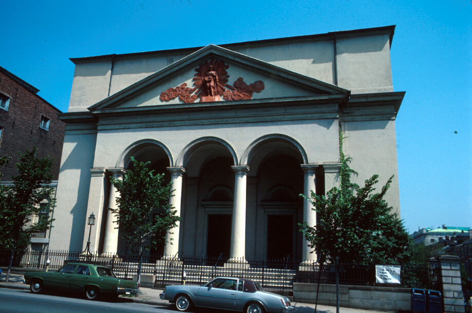 The First Unitarian Church is essentially a domed cube, with walls of brick and stone masonry covered with stucco. The main entrance, on the south side, is covered by a shallow, pedimented portico formed by three arches on Tuscan columns. The porch roof is vaulted, and the five entrance doors are separated by Tuscan pilasters. Within the portico pediment is the only exterior non-architectural decoration--a reproduction of a terra cotta sculpture of the "Angel of Truth" appearing from a sunburst. The angel holds a scroll inscribed in Greek letters: "To the Only God." Originally executed by Antonio Capellano, the sculpture was broken in the 20th century and restored by Baltimore sculptor Henry Berge. Within the porch is the entrance, with three doorways flanked by plain pilasters which repeat the rhythm of the porch columns. The porch is raised on a sandstone base with five marble steps. The ceiling of the porch is groin vaulted. The entablature of the pediment continues around the entire building. The three-arch motif of the front facade is also employed on the sides of the building, with three windows in arched niches forming the primary decoration. The nearly square interior is crowned by a large dome, 55' in diameter. Once the distinguishing feature of both the interior and exterior, the dome was obscured in 1893 by a plaster level-vault installed to improve the acoustics on the interior. The ceiling, apart from this dome, is a giant barrel vault running from the entrance in the south to the altar in the north, coffered and decorated with large elaborate rosettes. The triple arch motif is repeated on the interior at the side, forming a nave arcade between the side aisles (at the wall) and the main body of the church. There is one main, central aisle leading to a raised chancel, also with coffered ceiling, and having a mosaic of the Last Super over the altar. There re three blind windows filled with stained glass behind the altar; the glass in the side windows is non-iconographic, being simple geometric designs. There is an organ loft at the rear supported by four columns similar to those on the exterior. The decoration is fairly rich and includes pilasters with Corinthian capitals between the arches. There are few monuments on the walls. Slip pews are at least 19th century, if not original. The mosaic of the Last Supper and the stained glass windows are late-19th century additions, products of the Tiffany studios.