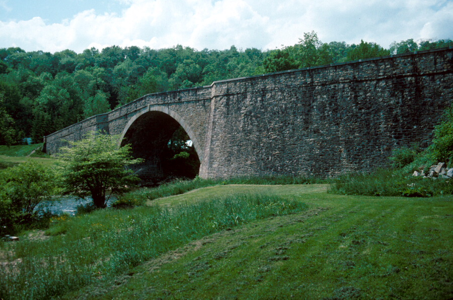 The National Road was the Federal government's first experiment in public highway construction. Congress authorized the road's building in 1806 and by 1818 the road stretched from Cumberland, Maryland, to the Ohio River in what is today West Virginia. Because of the controversy regarding the propriety of the national government's participation in public road construction, the project was halted until 1828. The old National Road provided ready access to the trans-Appalachian region and greatly stimulated its settlement and growth. The Casselman Bridge was an integral part of the National Road, and at its completion, possessed the largest stone arch in the United States. Built about 1813, the bridge remains a splendid paradigm of early American engineering prowess. A traveler of the period spoke of it in laudatory terms calling it simply "superb."