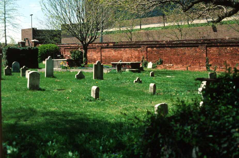 Old St. Paul’s Cemetery is a 2.4 acre walled burial ground in south-central Baltimore. It is bounded on three sides by streets, Redwood and Lombard Streets and Martin Luther King Boulevard, and by the University of Maryland campus on the fourth. The walls are stone on three sides and brick along Redwood Street. The entrance is on Redwood Street through a pair of iron gates. Laid out about 1799, the cemetery is divided into a grid pattern of paths intersecting at right angles with the graves arranged in the east-west manner. The plots are generally twenty-four feet in depth with the widths in multiples of eight feet. The graves are marked with monuments or vaults ranging from simple and plain stones standing erect or flat on the ground to columned monuments and tablets. In 1817, some older burials were moved to St. Paul’s from other cemeteries. A section along the west side was destroyed for a highway project in the 1970s. The wall along Martin Luther King Boulevard dates from this project. Archeological testing in this area revealed a number of unmarked paupers’ graves, mainly late 19th-early 20th century in date. These were moved prior to construction.