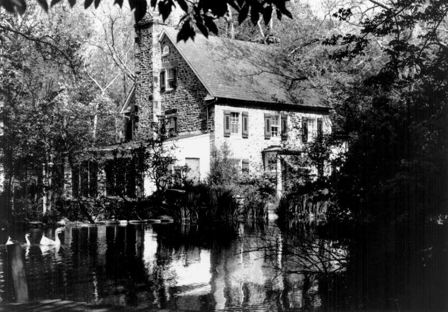 The Heighe House complex, located on a steeply sloping 17-acre site along Bynum Run, consists of a Colonial Revival, 2 1/2-story stone main house built on and incorporating the stone foundations of the c. 1745 Moores Mill; a 1 1/2-story frame chauffeur's cottage; garage; and a 1 1/2-story stone and frame guest house. The main house is a relaxed Colonial Revival structure of stone and frame. Built into a slope, it is 2 1/2 stories on its stone (south) entrance, and 3 1/2 stories tall on the stone and frame north façade toward the stream. It has a three-bay central section flanked by an enclosed one-story frame and glass porch on the west and a two-story, stone and frame library wing to the east. The main section and library wing are topped by steeply sloping slate-covered gable roofs with slates carefully calibrated and laid so that their size diminishes as they ascend toward the roof’s crest. All windows in main and library wings have 6/6 panes and massive eye-catching stone lintels, and are flanked by their original shutters. The massive and paneled entrance door is sheltered by a one-story one-bay porch with paneled end walls and with one of the old Moores Mill millstones incorporated into its floor. The west façade is dominated by the enclosed porch, reached from the living room by French doors, and by a massive off-center stone chimney. The north façade includes a terrace reached by three French doors framed by paneled shutters. The east façade is dominated by a massive stone chimney whose five flues are indicated by clearly visible chimney pots.