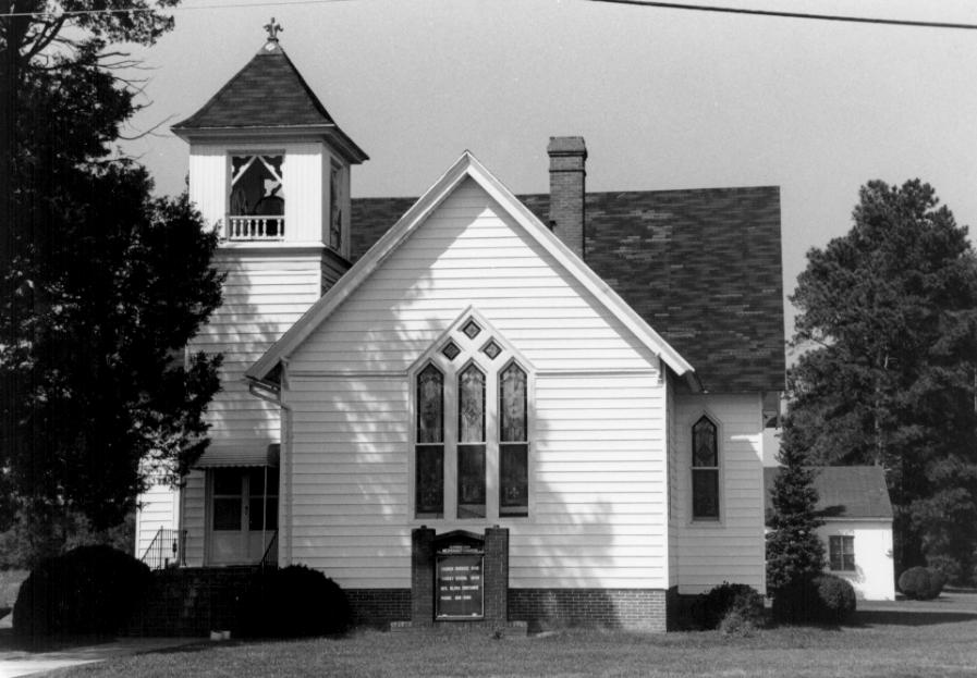 Quindocqua United Methodist Church, erected in 1913, is a single-story, roughly cruciform frame building resting on a raised foundation of common bond brick. It is sheathed with vinyl siding over narrow weatherboards, and the steeply pitched gable roofs are covered with asphalt shingles. The three principal gabled elevations of the church, facing south, east, and west, are marked by pointed-arch colored glass windows and fishscale shingles in the gables. The southwest corner is marked by a three-story tower topped by a pyramidal roof with kicked eaves. The open bell room at the top of the tower is trimmed with a spindled balustrade and sawn corner brackets. The principal elevation of the church faces south, with the ridgeline running east-west. Slightly lower gable-roofed projections face north and south. Corbeled interior chimneys rise from the east slope of the south projection, the west end of the south slope of the main roof, and the east end of the north slope of the main roof. All roof eaves overhang, with sawn brackets at the lower corners. All windows of the church are pointed-arched apart from those in the north projecting wing. This wing holds pairs of rectangular 1/1 sash stained glass windows in the side bays and the west bay of the north side. The interior of the church is distinguished by a well-preserved pressed metal vaulted ceiling, and the pulpit and choir are recessed behind Gothic arched openings. Pews are arranged in a semicircular pattern oriented towards the north. Also on the property is a single-story, concrete block church hall.