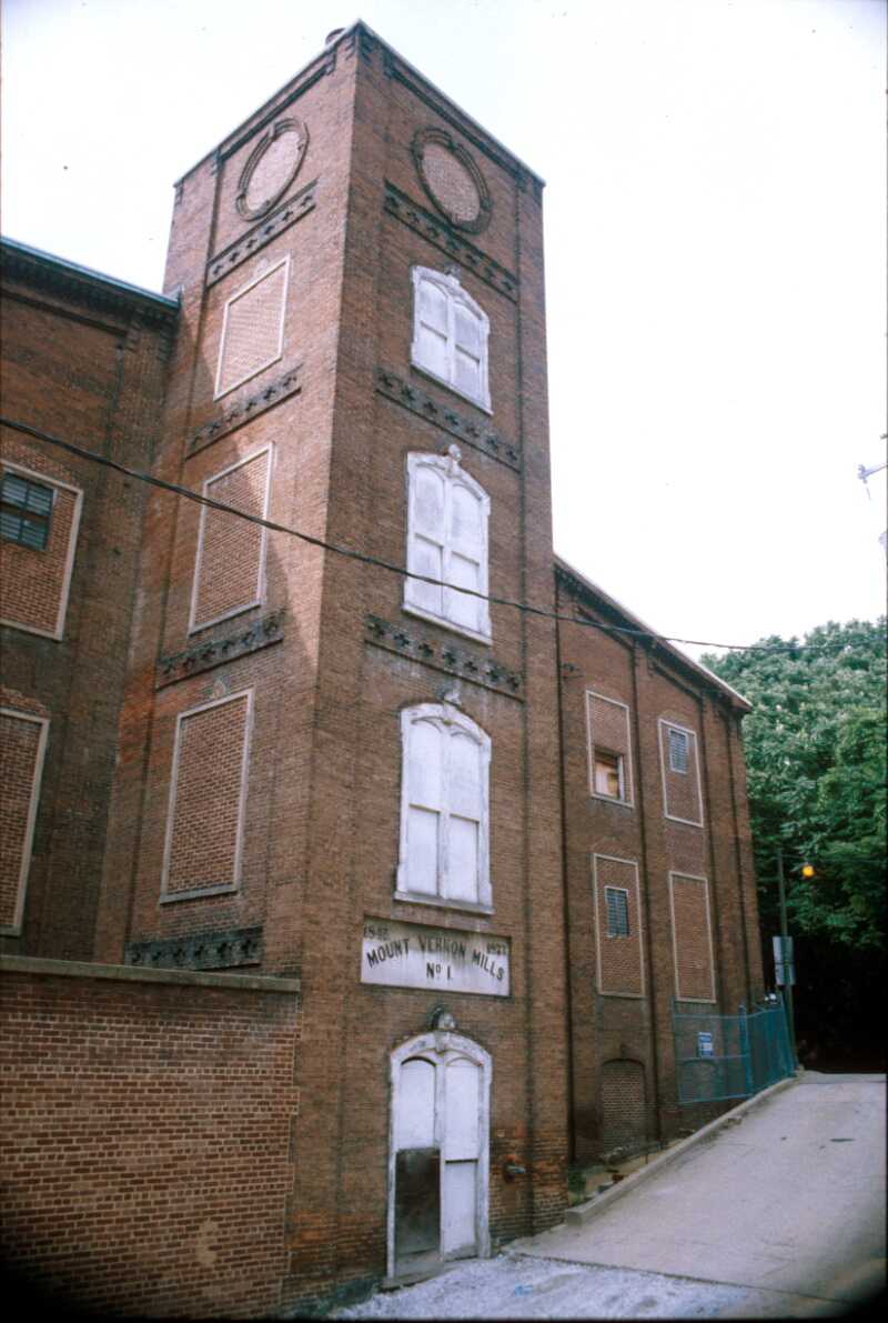 Mount Vernon Mill No. 1 is the southernmost surviving textile mill along Jones Falls. Part of a group of textile mills built by Horatio Gambrill, David Carroll, and William Hooper, along with Mount Vernon Mill No. 3, it served as headquarters for Mount Vernon-Woodberry Mills, one of the world’s largest producers of cotton duck. The mill complex is significant for the role it played in the development of Baltimore’s textile industry. Mount Vernon Mill No. 1 also is significant as an example of locally important changes in mill construction during the 1870s and 1880s, namely a marked expansion in size and scale and a consequent shift from stone to brick buildings. The period of significance for the complex extends from 1873, the date the present Mount Vernon Mill No. 1 was constructed, to 1945, the end of a surge in textile production associated with World War II.