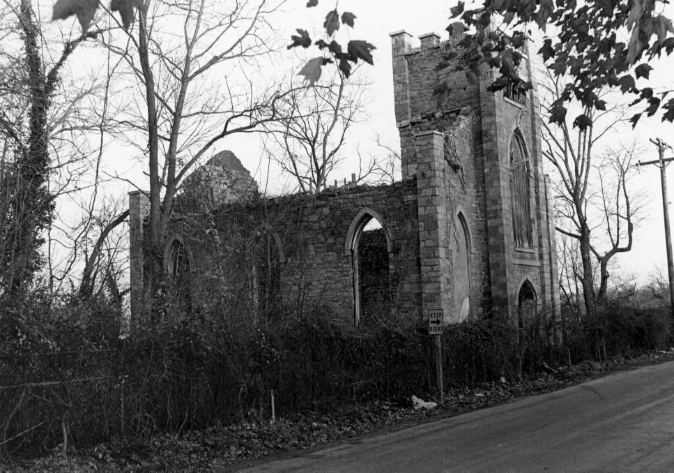 St. John’s Chapel of St. Michael’s Parish is a granite Gothic Revival ruin. Similar to other early Gothic Revival chapels built during the second quarter of the 19th century, St. John’s is basically a rectangular box with a west tower. It is almost identical to the Episcopal Church at Newark, Delaware, except that the Delaware church is covered with stucco and painted white. This type of church is similar to some New England meeting houses, but here the New England steeples are replaced by a crenelated tower. The windows are pointed and have Gothic sashes. The building measures 35’ wide and 50’ deep, not including the square crenelated tower protruding from the west facade. There are the remains of a chancel and sacristy on the east end. The windows and doors have lancet arches composed of four pieces of dressed granite. Two plaster panels of the same size and shape as the side windows flank the entrance tower. Above the double doors in the tower is a huge lancet opening, formerly a window, but now filled in with boards. Below the top of the tower and above the arch is a short arcade. At each corner of the structure is a square buttress which extends above the former gable roof. The chapel having been abandoned around 1895 and allowed to deteriorate, few pews, sashes, blinds, etc. have survived. Nevertheless, enough detail remains to effect accurate restoration drawings of the vestibule and nave.