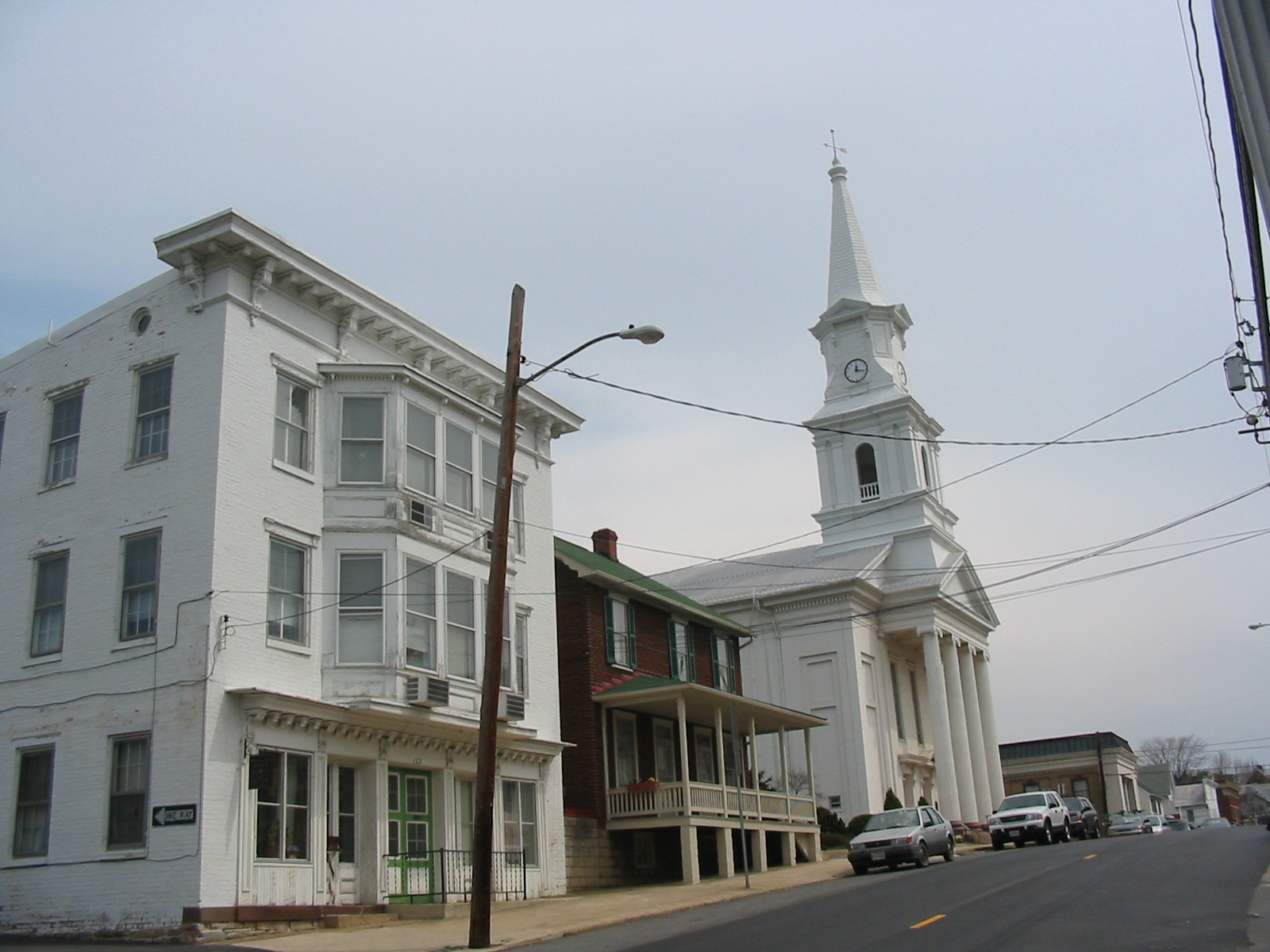 Middletown Historic District, located on the Old National Pike about halfway between Frederick and Boonsboro. Middletown's lots were laid out primarily along the north and south sides of West Main Street. As the town grew to the east, Main Street was divided between East and West, with Church Street serving as the dividing line. Two large cemeteries are located within the historic district. The German Reformed Cemetery fronts onto East Main Street and dates to the settlement period of Middletown; it includes the graves of veterans from the Revolutionary War through the conflicts of the 20th century. The Lutheran Cemetery was moved to its Green Street location in 1928 and also includes a number of veteran interments. Historically Middletown was a bustling turnpike and interurban electric railway town with hotels, stores, and industries as well as a wide variety of houses. Middletown today retains much of its historic appearance, including many of its 19th century storefronts. However, the town now serves primarily as a bedroom community with greatly reduced commercial activity. The decline was influenced by the re-routing of U.S. Route 40 to the north in 1936, the loss of the electric railway in 1947, and the construction of Interstate 70 in the 1960s. The streetscape of the Middletown Historic District reflects the historic development of the town through several periods. Although most of the settlement period buildings were probably replaced in the mid 19th century, there are a few scattered buildings from the late 18th century, primarily of log construction. Later brick and log buildings from the early to mid 19th century, associated with the increased traffic along the National Pike, are located along Main and Jefferson Streets and reflect a melding of the Germanic vernacular with the nationally popular Greek Revival architectural style. In the second half of the 19th century, prosperity in the fertile Middletown Valley brought the addition of numerous Victorian period houses and storefronts. Many houses along West Main Street were modified with Gothic Revival stylistic elements, primarily on porches and with the addition of central cross-gables to the roofline. The larger High Victorian Gothic, Queen Anne style, and Colonial Revival houses along East Main Street, several used as tourist boarding houses, mark the coming of the electric railway in the last decade of the 19th century. Along the north side of East Main Street the houses in the 300 and 400 blocks have a particularly wide setback resulting from the railway right-of-way, the only real residual evidence remaining in Middletown of the electric railway's existence. The first three decades of the 20th century, the final period of significant growth in Middletown, are identified by the Prospect Street School, Colonial Revival houses, and numerous porch additions, Classical Revival commercial buildings, and a number of industrial-use buildings.