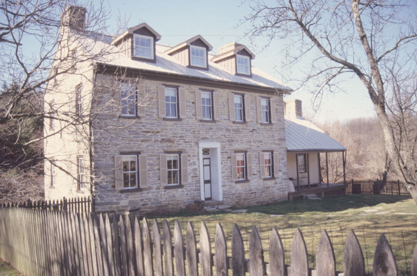 Set on the edge of a bowl-like crease in Catoctin Mountain just below Braddock Heights, Rich Mountain occupies a 10-acre tract which remains from the original farm. The complex consists of a stone dwelling dating from 1810-1820 with a one-story kitchen wing, a frame Pennsylvania-style forebay bank barn from the mid-to-late 19th century, a hog barn, wagon shed/corn crib, equipment shed, and chicken coop. Facing east, the two-story, five-bay stone dwelling has a central entrance and a one-story, two-bay kitchen wing addition attached to the north gable end. Behind the house, the land slopes downward leaving a walk-out cellar on the west side of the house. A nailing course just under the upper story windows at the back facade, extending nearly the length of the back wall, marks the roof attachment location of a porch that once sheltered the entrances at the cellar and main story levels. The roofing material is currently standing seam metal, installed in the 1970s. Roughly coursed local stone forms the walls of the house. Stone chimneys with corbeled tops extend from inside each gable end of the building. A plastered date tablet with an arched top lined with brick is set into the south chimney at the peak of the gable. Unfortunately, an inscription is not discernable. There is no particular decorative masonry associated with the exterior of the building, although above most of the windows are either two flat stones that meet near the middle of the span, or a single flat stone extending across the opening. Windows have wide mortised and tenoned frames secured with pegs at the corners. Only at the front facade have they been replaced, probably around 1870, with 2/2 sash windows. The rear facade and the back half of the south side wall retain the original 9/6 sash windows. Shutter hardware remains. At the front facade, replacement louvered shutters are in place. Three added gable-roofed dormers extend from the east face of the roof. Original attic windows have 4/2-light sash. The main entrance is in the central bay of the front facade. The door has six low-relief molded panels hung with deep paneled jambs with matching molding. Above the door is a diamond-pane transom, which may be a later alteration from the 1860s or 1870s. A secondary front entrance opens into the kitchen wing. It also has a six-panel door hung beneath a transom with five rectangular lights. At the west facade are two entrances from the cellar in the central and south bays, and another at the main level which would have opened onto the high porch across the back of the house. The main level entrance had six molded panels, but no transom. Another rear entrance leads into the lower level of the kitchen. The lower-level entrances have battened doors. The front door opens into a central stair and entrance passage, with a back door at the rear of the space. An unusual feature of this and other first floor rooms in the house is the use of oak flooring, typically associated with 18th century construction and fairly rare in Frederick County. The house retains much of its original woodwork. The second floor has a similar floorplan, except that the area north of the passageway is divided into two rooms. Attached to the north end wall of the house is a one-story kitchen, constructed with stone and covered with stucco. A deeply recessed work porch extends across the front, and the rear facade, because of the topography, has an exposed cellar story. The interior contains one room with a large service fireplace in the north end, two 9/6 sash windows in the east and west walls, and a door to the front work porch. In the southeast corner an enclosed stair leads to an attic. The kitchen wing appears to be an addition to the main part of the house and probably dates from a short time after initial construction. According to the property owners, the house was altered in the late 19th or early 20th century with the application of German siding across the front facade. Approximately 200 feet east of the house stands a frame Pennsylvania bank barn with its forebay facing north, apparently dating from the 1860s-1880s. It rests on stone foundations, which enclose the forebay end walls. Recesses in the stone forebay walls provide storage space for small items.