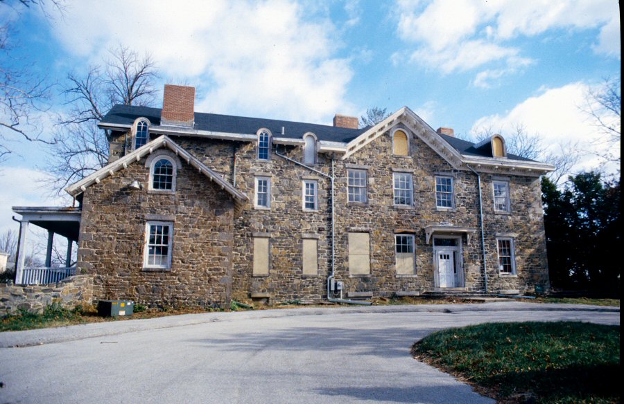 Ruscombe is a 2 1/2-story with basement, fieldstone Italianate mansion constructed in 1866, located on a 1.35-acre lot in a residential neighborhood called Coldspring/Newtown in north Baltimore. It is a gable and hip-roofed building measuring approximately 90' x 50' overall. The main block of the building is 50' x 50', with a gable-roofed L-shaped wing extending to the north. A circular drive leads to the front entry and to a small hip-roofed stone garage to the west of the house. The west elevation, where the present main entry is located, is 7 bays wide. From the north end, the first bay is covered by a 1 1/2-story wing projecting to the west on both floors. The next two bays to the south are filled with narrower 2/2 sash windows. The final four bays contain 6/6 sash windows with stone lintels and sills on the first and second floors. The entry door, in the second bay from the south end is wood surrounded by a 4-light transom and 3-light sidelights and protected by a small roof supported by wooden brackets. An intersecting gable with an Italianate detailed rake spans the second, third, and fourth three bays from the south. An Italianate-detailed cornice extends 18" from the face of the stone and extends around the entire house. Within the gable is a round-arched window at the attic level. Also on the west elevation is one round-arched dormer with an arched roof on the hip roof over the south bay; three round-arched wall dormers are cut into the roof eave of the wing. The 1 1/2-story stone wing to the west is, 12' deep and 25' wide, with a gable roof and shed dormer. It has 6/6 sash windows with half-round arched window with tracery at the attic level. On the north elevation of the main block, a porch with chamfered wood posts, railing, and balusters runs the full width of the four-bay first story. The gable end of the wing on this elevation has two 6/6 sash windows at the second floor and two round-arched windows at the attic level. The east elevation of the main block has four bays on the first story and three bays on the second, with 6/6 sash windows with stone lintels and sills on both floors. The second-story windows are aligned over the spaces between the first-story windows. On the third story a centered cross gable similar in detailing to the one on the west elevation carries a round-arched window and wooden balcony supported by brackets. In the corner where the main house and wing connect is a concrete block exit stair built when the property was used as a school. On the wing north of the stair tower there is a 6' wide original window that is behind a plywood infill; on the north elevation of the main block there is an original 6' wide door also behind a plywood infill. The south elevation of the house has three bays on the first and second stories, with the center, projecting bay containing a wide wooden door which was the original entry. It is covered by a small roof supported by wooden brackets. Flanking the door are 5' wide original door openings with two rectangular 2-light transoms per door. On the second story above the door large window comprised of four narrow 1/1 sash windows. The flanking second-story bays contain paired 2/2 sash windows. A stone porch spans the entire width of the elevation. Ruscombe was originally a fully realized Italianate design, but a fire in 1955 destroyed its hip roof, which contained a south-facing gable, a belvedere with balcony, and gable dormers. These elements appear in historic photographs of the house. The gable on the east elevation and the original roof eave survive. A porch that wrapped around the south and east elevations, also visible in the photographs, is no longer extant. A garage built in the early 20th century of matching stone is linked to the house by a stone wall. On the interior, the entry on the west elevation leads to a hallway that intersects the original, 10' wide main hallway. The interior walls of Ruscombe are built of 2' thick stone. The first floor rooms are still in their original locations with original door openings, although most of the original doors are no longer extant. Most wood window and door moldings are original, with some original windows remaining. A 12" deep plaster cornice with a cavetto molding runs the perimeter of most rooms. Some fireplaces remain with their original trim intact, but others have been walled in. The main stair is in its original location, but has been rebuilt with new treads and risers, railings, and balusters.
