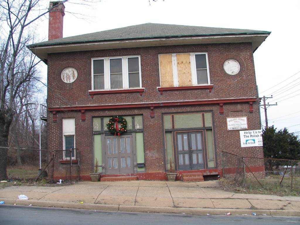 Polish Home Hall derives historical significance for its association with the Polish immigrant community in the Baltimore area. Beginning around the turn of the 20th century, the Curtis Bay community received an influx of immigrants arriving from Eastern Europe to work in the new industrial concerns operating in the area. Constructed c. 1905 to serve the combined functions of town hall, volunteer firehouse, and community center, the building occupies an entire block within the small community, and represents a substantial and highly visible institution. In 1925 United Polish Societies purchased the building and named it Polish Home Hall. Polish Home Hall was central to the Polish experience in Curtis Bay. A Polish school, which had been started in St. Athanasius Church in 1909, was moved into the hall in 1925 and operated there into the 1930s. The property continued to function as a social, educational, and political center for Curtis Bay's Polish community into the 1970s. The property derives additional significance for its architectural character, exhibiting a vernacular interpretation of Beaux-Arts design through its classical symmetry and detailing. The building retains much of its original architectural character and integrity. The exterior remains substantially unchanged in its masonry, fenestration, and detailing, and the building retains its general roof form, deep projecting eaves, and chimney. Numerous large windows allow ample light into interior spaces characterized by high ceilings and finished in pressed metal. Early lighting fixtures survive on the second level and wainscoting and other decorative elements are found throughout the building. Some changes were made c. 1919 when the building was converted from its original function as city hall and fire station to use for the manufacture of sailcloth. The east elevation entrance for the fire wagon was presumably altered at this time, when the firehouse ceased operations.