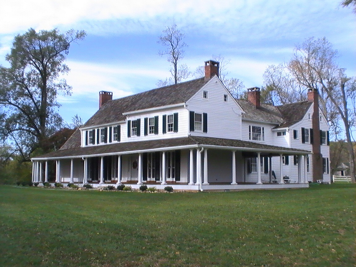 Richland Farm consists of a log and frame house, the earliest section of which is presumed to date from c. 1781, and a complement of domestic and agricultural outbuildings reflecting the farm’s continuous use through the mid 20th century. The main block of the main house, facing southeast towards Sheppard Lane, was built in three sections, with a large addition on the rear. The three main sections, all clad in weatherboards, each have a gable roof running northeast-southwest, covered with new wooden shakes. The northeast section of the main block, of frame construction, is two stories high, three bays wide and two deep with an interior brick chimney on the northeast gable end. The center section, constructed of log, is also two stories high, three bays wide and two deep, and has an exterior brick chimney on the southwest gable end. The southwest section is one story, and one bay by one bay. It is also of log, with weatherboards on the southeast elevation and German siding on the southwest. The entire southeast elevation is sheltered by a one-story shed-roofed porch supported by Doric columns, which wraps around the northeast gable end of the building. The portion of the porch in front of the southwest section is partially enclosed and is supported by square posts. The northeast section of the building has a six-panel door in the southwest bay of the first story, with sidelights and a fanlight. The center and northeast bays contain French doors with five lights in each half of each pair. The center section has three French doors on the first story, which match those in the northeast section. The second stories of both of these sections contain three 6/6 sash windows. The southwest elevation of the center section has two small 4-light windows flanking the exterior chimney in the attic gable. The southwest section of the main block is set back about 6” and has no openings. The southwest facade of this section bears a tripartite window on the first floor, consisting of a 6/6 sash window flanked by narrow 2/2 windows. The second floor has paired 8-light casements. There is a new one-story shed-roofed addition on the northwest side of the southwest section, covering five bays and connecting to the two-story rear addition. This addition, itself, contains two sections. That perpendicular with the main block is three wide bays long, containing a combination of 6/6 and tripartite windows on both stories. An interior chimney pierces the northeast roof slope. Attached to this addition on the northwest gable end is a 2-story section, running northeast-southwest, parallel with the main block. This section is one wide bay on its northwest and southeast facades, and one narrow bay on its northeast and southwest gable ends. This section is pierced by several tripartite windows and French doors. A one-story portico shelters the French doors on the southwest gable end, supported by square posts and carrying a balustraded deck accessed by second-floor French doors with sidelights and transom. Above this door, in the attic gable, is a pair of 3-light casement windows. An interior brick chimney stands at the northeast gable end, flanked by 2/2 windows on the first floor, 6/6 windows on the second floor, and small attic windows in the gable. This elevation of this section is extended to the southeast by another bay on both floors, covered by a shed roof. The northeast elevation of the main block holds a single 6/6 window in the southeast bay of the second floor, and two small 4-light windows in the attic gable. Also on the property are the Superintendent’s House, a two-story, four bay by two bay structure also facing southeast with an interior brick chimney on each gable end. The southwest half of this building is a log structure, and the northeast half is a frame addition. There is a two-story, two-bay by two-bay frame wing on the northwest clad in German siding. The Gardener’s Cottage is a one-story, three-bay by one-bay frame structure with a one-bay shed addition on the southeast. Also on the property are a frame wagon shed, a tractor shed and smokehouse with board-and-batten siding, and a barn with vertical siding and board-and-batten siding on its additions. A stone springhouse and “Barrack” complete the outbuildings.