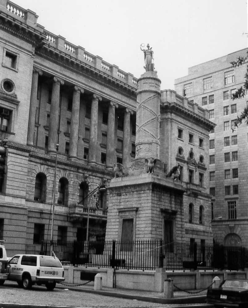 Battle Monument is second only to the Washington Monument as the finest early monument in Baltimore and one of the reasons Baltimore was called "the Monumental City." It is significant for its Egyptian Revival architectural design and as a democratic monument displaying all the names of those who died in the Battle of Baltimore, regardless of rank. It was designed by Maximilian Godefroy, an important early architect in Baltimore. The sculptor of the statue was Antonio Capellano, the artist of the bas reliefs of Christ and Moses on St. Paul’s P.E. Church. The monument is rich in symbolism: the 18 layers of marble at the base represent the 18 states in the Union at the time of the battle; the columns is made up of staves or rods, a symbol of unity held together by the bands inscribed with the names of those who fell in the battle; the statue holds a wreath of victory standing next to the eagle, the symbol for the United States; and in her left hand is a rudder, symbolizing stability. Although the surroundings of the Battle Monument have changed a great deal since 1825, it remains an impressive monument and a centerpiece of Monument Square. It is the most important monument in the Financial District and the oldest structure in this part of the downtown area.