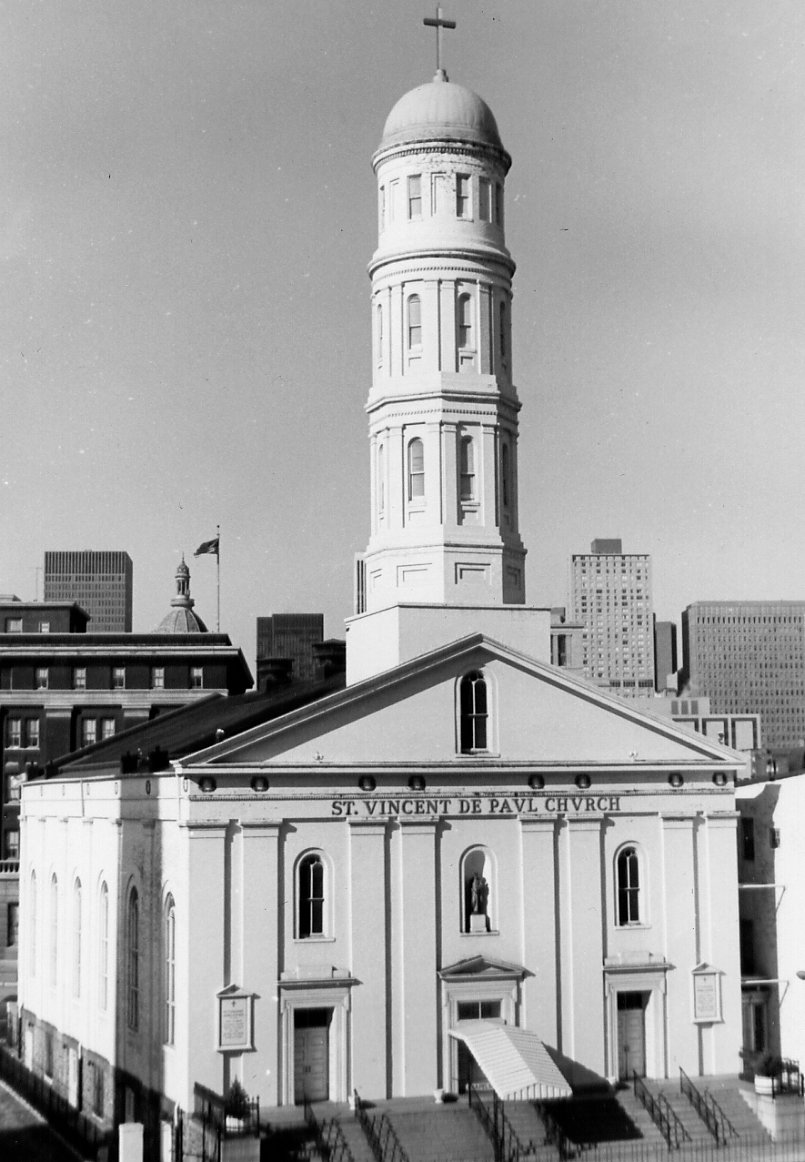 The chief distinctive feature of St. Vincent de Paul Church is its slender Georgian-style tower which rises to a height of 150 feet above the narthex and contrasts sharply with its surroundings. This unique brick tower, painted gleaming white as is the entire building, rests on an octagonal base and supports three successive indented tiers (one octagonal and two cylindrical), capped by a copper-sheathed dome and twelve-foot cross. In style, the building relates to the classical revival churches built in London and Paris in the 1820s and, although no architect can be ascribed, the restrained exterior pilasters and moldings of Georgian influence are very much in the tradition of the carpenter-draftsman as practiced by John Hall of Baltimore during the early 19th century. The front façade is divided into three bays by double engaged pilasters. Each bay contains a doorway---the central one topped by a triangular stone pediment and each of the flanking doors by flat stone lintels. Over the doorways are arched windows at the second story level, except that the central bay contains a niche with a statue of St. Vincent. There is a similar arched window in the pediment above. A steep flight of stairs leading from the street crosses the entire front façade. The side elevation contains six bays each with a large arched window similar to those in front and separated by single engaged pilasters. Just below the roof cornice is a frieze of gilded swags placed at regular intervals around the entire building above each pilaster.