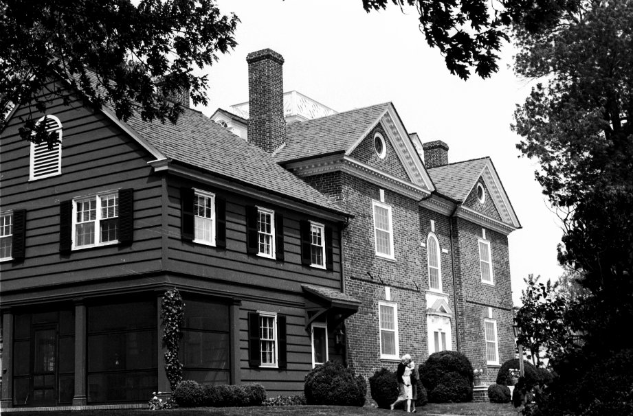 Mt. Harmon is an 18th century brick mansion built by Sidney George around 1788. The house was restored in the 1960s under the supervision of Albert Kruse, A.I.A., the architect of the State House restoration in New Castle, Delaware. The house measures 50' x 32', and the majority of the walls of the double pile structure are original. In the late 1920s a frame wing was built on the south gable. The five bay main facade, facing west, has a central door with a scrolled pediment and pineapple keystone supported by Ionic pilasters. Windows are 12/12 sash with splayed brick jack arches with stone keystones. A one-bay-wide pediment with a bullseye window and modillion raking cornice is centered on the hip roof, and is flanked by two gable-roofed dormers with round-arched windows and pilasters. A single dormer of the same style appears between paired interior chimneys on both the north and south ends of the house. The east facade of the roof holds a single dormer between two pediments with bullseye windows. The top of the hip roof features a widow's walk with a Chinese Chippendale balustrade. A dentiled and modillioned cornice surrounds the roof on all sides. The east facade of the house is three bays wide, the two outer bays holding a 12/12 window with the same arches as on the front, and the central bay holds a tall round-arched window above a recessed door with pedimented surround. The north gable end of the building holds a single 12/12 sash window in the second story. The south gable end is covered by a two-story frame wing covered with beaded clapboard. This wing holds 6/6 sash windows. The interior of the house has been entirely reconstructed with a center hall containing a Chinese Chippendale stair leading to the third floor. The parlor on the north and the dining room on the south are fully paneled. Near the house stands a small one-story brick structure, formerly a kitchen for the farm. There are also stables and residences for the caretakers of the estate. West of the house stands the 18' x 24' hewn frame prize house mentioned in Sidney George Fisher's diary in the 1830s.