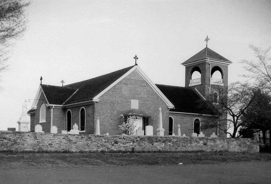 St. James’ Church, constructed in 1755, is a brick church originally consisting of a rectangular structure with a semicircular apse in the east end. Less than a decade later (1759-1762) the congregation enlarged it to a T shape with the addition of what is now the nave to the south façade of the original structure. A narrow rectangular addition to the center of the north façade was made in 1905 to accommodate the altar. The bell tower at the southern end of the stem of the T dates from 1884. Each of the semicircular headed windows contains religious scenes executed in stained glass. The transept which measures 60 by 30 feet was constructed of brick laid in Flemish bond. Dark headers appear regularly beneath the ogee shaped water table. Flanking the door on the western end are two decorative diamond patterns worked into the wall in dark headers. The pattern, although smaller in size, is repeated on the south elevation flanking the two windows. The semicircular apse at the east end, now the sacristy, covers the central half of the east elevation. The two round headed windows, in contrast to the rest of the structure, do not have stained glass. The windowless west end contains a door with a plaque above which gives the dates of the transept (1755) and the nave (1759-1762). The 1905 extension in the central bay of the south façade, was constructed in all stretcher bond. A round-headed window shorter than the others is located in the center under the gable roof. The nave which extends to the south follows the construction of the transept, although no dark headers appear in the brickwork. A three story tower in common bond terminates the nave. The principal entrance on the south elevation consists of a double door under a semicircular fanlight. The three exposed faces each contain one round-headed window in the second story. The third story is an open belfry defined by one brick arch on each face which extends down through the second floor. The tower has a low pitched pyramidal roof with a cross finial. On the interior, the church has a vaulted ceiling, box pews, and a herringbone patterned floor. Iron tie-bars extend across the interior in several places. A cemetery enclosed by a stone wall surrounds the church.