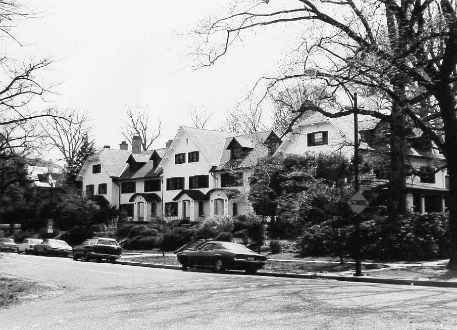 The Roland Park Historic District is a planned residential neighborhood in northwest Baltimore. Located north of the intersection of University Parkway and Stony Run, and south of West Lake Avenue, it contains 1,068 structures. The architecture of the district typifies the romantic tastes of the turn of the 20th century, with many examples of the Queen Anne, English Tudor, Georgian, and Shingle Styles. A shopping center, one of the first in the country, was included as part of the plan. Located on the west side of Roland Avenue just north of Upland Road, the principal façade was executed in an English Tudor style often repeated in residential construction. The ridge of the roof, which parallels Roland Avenue, is broken at either end by a two-story cross gable with a gambrel shape. In between, seven dormers (three on the second floor and four at the third) project from the roof. The stuccoed ends of the roof curve down from the chimneys in a manner associated with Jacobean architecture. The Roland Park Country Day School and the Baltimore Country Club are landscaped following the overall pattern, and contribute to the character of the District. While the structures within Roland Park are of great importance in the creation of its atmosphere, it is indeed the setting which occupied the minds of its planners, Olmsted, Kessler, and Couton. The preservation of the natural terrain and vegetation, the parklike setting, the wooded paths and streets which wind uphill and down, all contribute to the uniqueness of this splendid garden suburb.