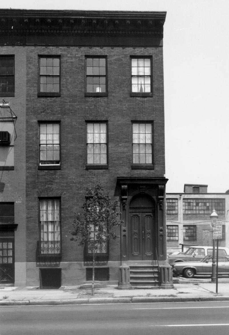 915 Cathedral Street is located in a once-fashionable section of Baltimore. The building is a 3-story, red brick rowhouse, probably constructed in the 1880s, and typical of Baltimore rowhouses of the period. A base of stone is punctuated with a basement entrance on the left and a small central window. A short flight of stone steps, flanked by stubby octagonal stone newels with flattened bell caps, leads to the first floor entrance, in the south bay of the west facade. The round-arched entrance is surrounded by a wooden frame and door cap. The framing members are decorated with lozenge and bullseye carvings, a motif which is repeated in the paneling of the double door. The semicircular transom is sheltered by a projecting, flat-arched door cap which is supported by bold consoles with acanthus detail, which flank a rolled keystone. All windows are original. First-floor windows are double-hung with 6/9 lights and are capped with flat-arched lintels, but there are no lintels above those of the third floor. Second- and third-floor windows hold 6/6 sash. All windows have splayed jack arches. A high wooden cornice with a row of dentils and modillions with rosettes adorns the roof. On the interior, the kitchen contains the original stove, and the dumb waiter to the first floor dining room still functions.