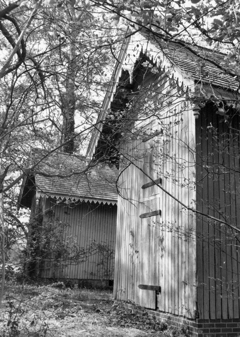 The interesting feature about the Victorian Corn Cribs near St. Michaels is the elaborate tracery along the eaves and bargeboards. The two cribs are connected by a low, rough shed. In the front end of each structure are two doors, one directly above the other, each with large, iron strap hinges. The buildings are constructed of vertical boards with horizontal boards in the gables. At the corners of the eaves are turned pendants. At the peak of the front and rear gables of both buildings is a wooden finial supported by carved brackets. The corn cribs were moved from their original site on the north side of U.S. Route 13, about two miles east of Westover, in Somerset County, to their present Talbot County site in June 1975. The tracery on the cribs is reflective of that on the Victorian-style house which stood on the Somerset County property.