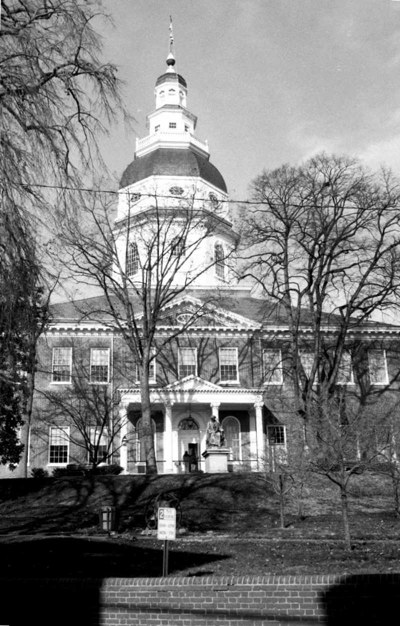 Architecturally, the Maryland State House is a severe brick structure topped by a tall octagonal dome and cupola. The main entrance facing the east, is protected by a one-story pedimented Corinthian portico with marble floor, four wooden columns, iron capitals, cast iron railing, and decorated with a modillion cornice and raking cornice in the pediment. This portico appears to be a later addition. The portal opens into a wide arched hall of similar classic order under the central dome, which has arched and oval windows and delicate plaster ornament in the Adam style, completed in 1793. Windows, with splayed jack arches, are 12/12 sash, with four on either side of a central three-bay projection, making the building 11 bays wide on the east façade. The building is ornamented with a heavy modillioned cornice and a central pediment with an oval window on the east side. The large octagonal dome rises from the center of the hip roof, which has a balustraded deck on the west side. The dome itself features modillioned and dentiled cornices, traceried oval windows in the octagonal portion, a balustrade above the dome, surmounted by a two-level octagonal cupola with 3/3 sash windows on the lower portion and louvered shutters covering windows on the second portion, each surmounted by a three-light fanlight. At the very top of the dome is an acorn-shaped finial. The west portion of the building, added in the early 20th century, features a massive 2 1/2-story portico supported by six columns. This side of the building is 13 bays wide, with four bays on either side flanking the portico, which covers five interior bays. A central pedimented entrance within the portico is flanked by pedimented windows on the first floor. The second floor has five windows, the central three of which are grouped slightly together. Over the entrance to the Old Senate Chamber is a curved balustraded spectators gallery, supported by fluted Ionic columns. Facing the entrance is the circular speaker’s platform. Typical of late Georgian Colonial design are the 12/12 sash windows with deep paneled reveals, window seats, and inner shutters, and the classically trimmed fireplace. Opposite the Senate Chamber is the Old Hall of Delegates, next to which is the present Historic and Flag Room, used for exhibit purposes.