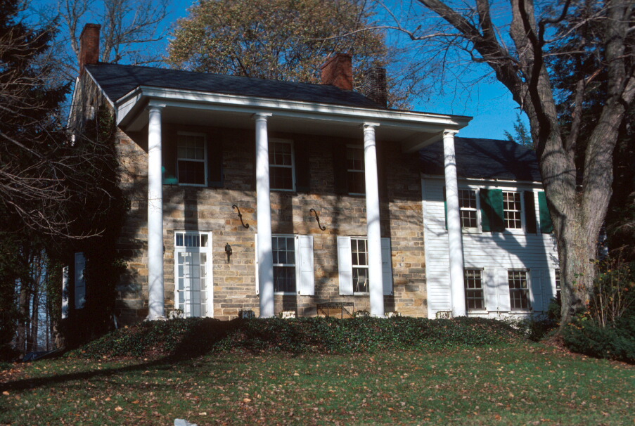 The main section of the house known as Woodside, designed in 1823, is an excellent example of a Federal side hall, double parlor plan house. This section is 2 1/2 stories tall, three bays wide, and two deep. The house is constructed of coursed fieldstone except the south front which is coursed ashlar. On the front (south) façade, the paneled front door with transom marks the western bay. Two windows with original paneled blinds light the southeast parlor. Upstairs, windows are aligned, also have 6/6 double-hung sash, but have louvered shutters. This fenestration is identical on the rear (north) façade. A massive interior brick chimney is located at the peak at the roof's east end. A simpler, smaller brick chimney with corbeled cap is located at the end of the roof. The 1 1/2-story fieldstone kitchen, also dating from 1823, is connected to the main block at the northeast end. On its north façade, a centrally located door leads into the workspace. Original 6/6 double-hung sash windows with paneled blinds flank the door. A later dormer window pierces the roof at the eave line over the door. A brick interior chimney is centrally located in the northern slope of the slate-covered roof. A beehive oven which once served the kitchen fireplace is now gone. Its approximate foundation dimensions are outlined by low fieldstone garden walls. One of the most aesthetically pleasing decorative details of the house is the use of stone. The stonework was laid very carefully--the fieldstone coursed as much as possible and the main façade laid in coursed ashlar of the same stone. On both the main block and kitchen, beautifully dressed stone blocks form lintels over each window. The lintel over the basement door bears the initials "IW", probably for the builder, Joshua Wilson. The name "Llee" is carved into the second step of the north entrance, and is believed to refer to Lycurgus Lee, a 19th century family member. In the second quarter of the 19th century, a frame, weatherboard sheathed structure was built at the southeast corner of the house. This addition, stretching three bays across the front (south) façade, was built to accommodate a growing Wilson household. The addition had 6/6 double hung sash windows, original paneled blinds on the first story (with louvered shutters on the second),and a gable roof. It was built over the stone kitchen wing, incorporating the slope of its gable roof. A number of outbuildings stand on the property, including a stone house with overhanging gable roof, a hand pump, a shed-roofed frame storage building, an 1848 log barn, a 1928 frame corn crib, and three early 20th century garages.